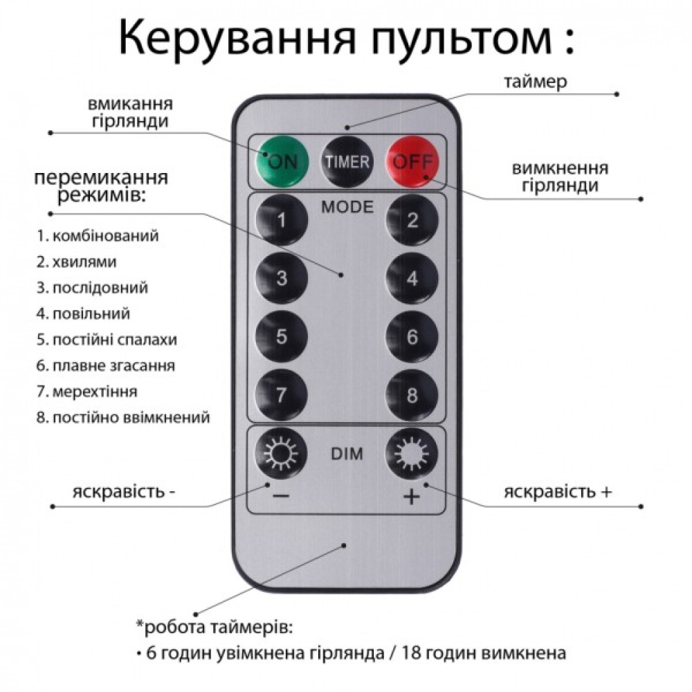 Зручний пульт дистанційного керування додає комфорту у використанні: він дозволяє вмикати та вимикати гірлянду, налаштовувати таймер і обирати різні режими. Таймер із заданими 8-годинними циклом роботи дозволяє економити електроенергію, що особливо важливо в пік святкового сезону.