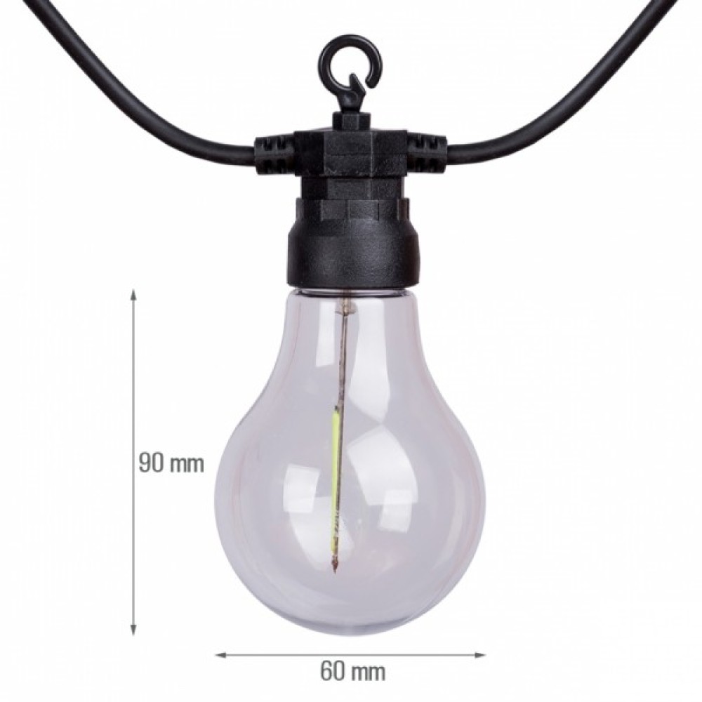 Ця гірлянда має загальну довжину 8 метрів, з яких 5 метрів відведено під секцію з лампочками, а 3 метри - довжина кабелю, що підключається до мережі. Десять багатобарвних лампочок, діаметром 60 мм і висотою 90 мм, випромінюють радісне, яскраве світло, створюючи атмосферу справжнього свята. Живлення здійснюється від стандартної мережі 220-240 В, 50-60 Гц, потужність складає лише 6 Вт, що робить її енергоефективною.