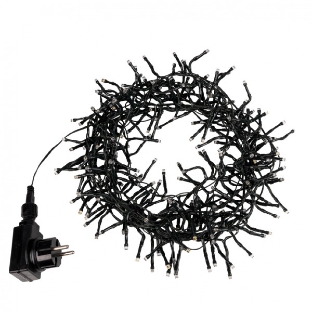 250 LED лампочок у формі капсул створюють неповторний ефект мерехтіння, який зачаровує погляд. Ефектні відблиски перетворюють будь-яку подію у справжнє видовище. Гірлянда живиться від мережі 220 В, що гарантує її стабільну роботу. Зелений колір кабелю дозволяє гірлянді вдало зливатися з природним середовищем, не відволікаючи уваги від краси світла.