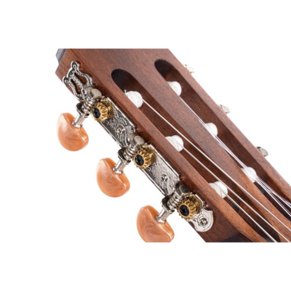 Покращена віялоподібна система зв'язок верхньої деки дозволяє помітно посилити резонанс вібрації нейлонових струн та отримати більш об'ємне та насичене звучання.