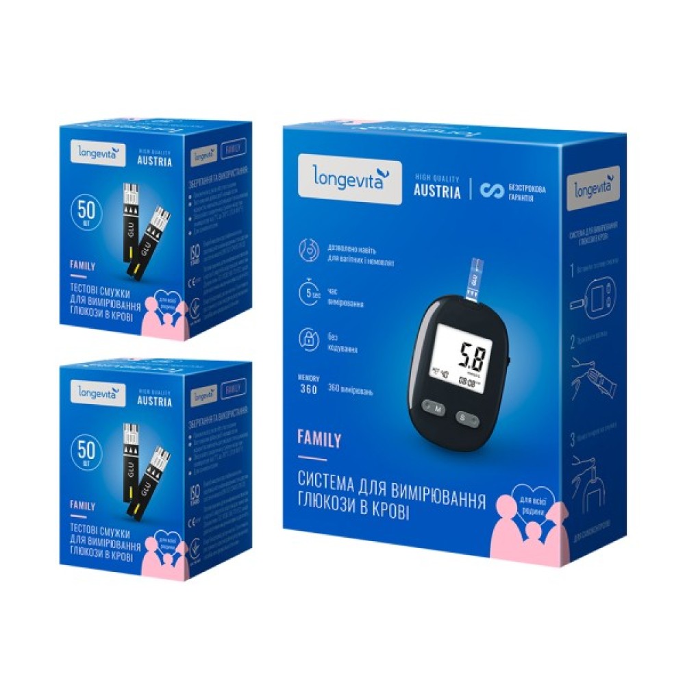 Глюкометр, Longevita, Family, Система, вимірювання, глюкози, крові, тест, смужки, 2, х, 50, шт, 6837149
