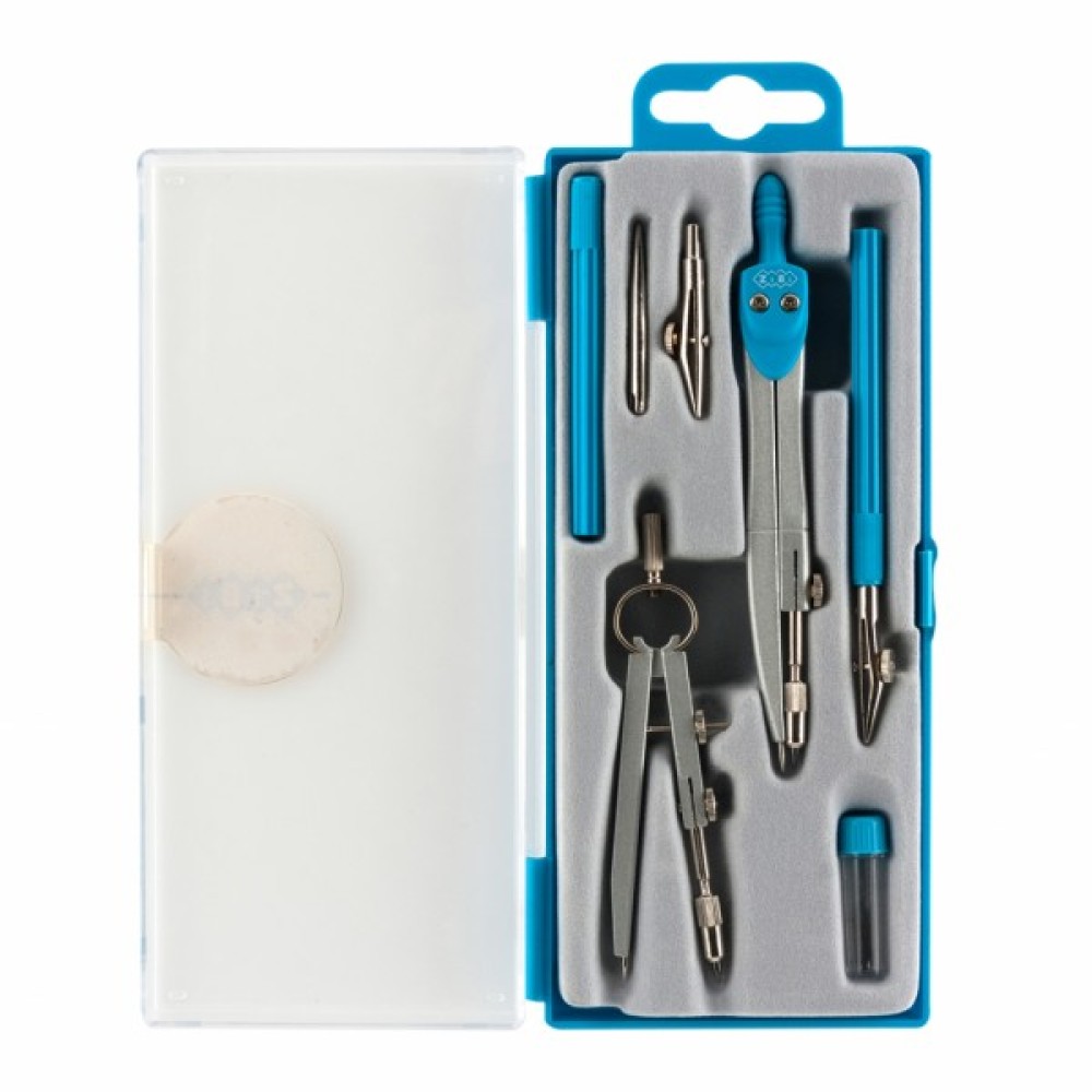 Готовальня Basis з 7 предметів: циркуль металевий,довжина 120 мм; кронциркуль, довжина 95 мм; рейсфедер з тримачем; вставка-рейсфедер; тримач для рейсфедера; вставка-голка; запасний грифель в пеналі. Упаковка: пластиковий футляр з кришкою. Призначений для креслярсько-графічних робіт олівцем. Може бути використаний в геометрії, кресленні, для навігації та інших цілей. Підійде для школярів середніх і старших класів.
