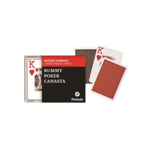 Гральні карти Опті - набір з 2-х колод із збільшеним розміром індексу, можна використовувати для будь-яких карткових ігор але ідеально підійде для гри у бридж, руммі, каната. Карти виготовлені з високоякісного картону з ламінуванням. Ламінування покращує ковзання та довговічність карт. Сорочка може бути в червоному або синьому кольорі. Розмір карт стандартний, вони ідеально підходять для будь-яких карткових ігор. Колода складається з 52 основних карт, 2-х джокерів та промокарти.