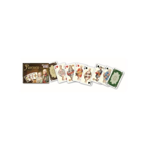 Гральні карти Рококо вишуканий набір що складається з двох колод. На картах зображені відомі історичні особи, сорочка має зелене та синє забарвлення. Карти виготовлені з високоякісного картону з ламінуванням. Ламінування покращує ковзання та довговічність карт. Чудово підходить для аматорської гри. Розмір карт стандартний, вони ідеально підходять для будь-яких карткових ігор. Колода складається з 52 основних карт, 2-х джокерів та промокарти.