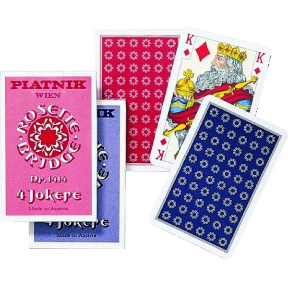 Гральні карти Розетка - стандартна колода, яку можна використовувати для будь-яких карткових ігор, але краще підійде для гри в бридж. Карти виготовлені з високоякісного картону з ламінуванням. Ламінування покращує ковзання та довговічність карт. Сорочка - може бути в червоних або синіх тонах. Розмір карт ідеальний для гри в бридж, також підходять для інших ігор в карти. Колода складається з 52 основних карт, 2-х джокерів та промокарти.