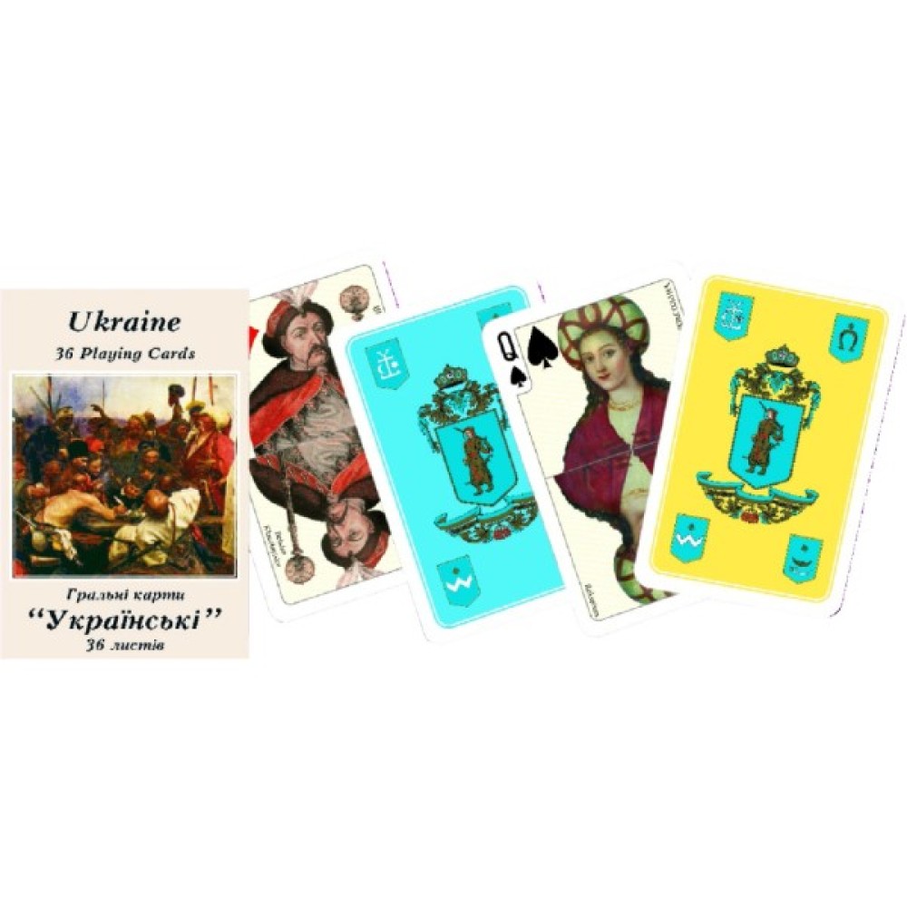 Гральні карти Українські - колода складається з 36 карт від 6 до тузів. Можна використовувати для звичайних карткових ігор, так і для подарунка. Карти виготовлені з високоякісного картону з ламінуванням. Ламінування покращує ковзання та довговічність карт. Внутрішній бік - зображення відомих діячів української історії, сорочка виконана в традиційному українському стилі з гербами та символікою, може бути в жовтому та блакитному кольорі. Розмір карт 58х88 мм.