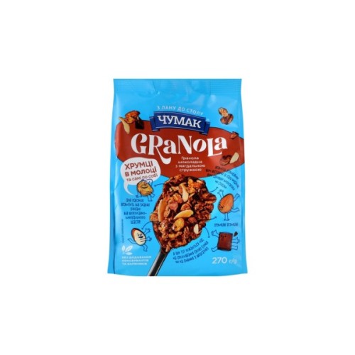 Гранола Чумак шоколадна з мигдальною стружкою — це смачне та збалансоване рішення для сніданку або легкого перекусу. Продукт складається з запечених вівсяних пластівців, шматочків чорного або молочного шоколаду, натуральної мигдальної стружки та підсолоджувачів на основі меду чи сиропу. Така композиція не лише забезпечує енергетичну насиченість, а й дарує справжнє задоволення від кожного шматочка. Особливості товару: Хрустка текстура завдяки запіканню при низькій температурі. Присутність мигдальної стружки надає вишуканості смаку. Містить натуральні інгредієнти без штучних барвників та ароматизаторів.