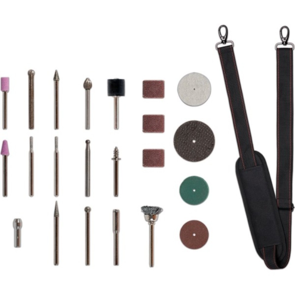 Готовність до негайного використанняІнструмент постачається з набором приладдя з 55 предметів, який складається з різних насадок для гравіювання, різання, шліфування, фрезерування, полірування та чищення. Крім того, в комплект входять 6 затискних втулок. Таким чином, інструмент пристосований для виконання безлічі завдань, а потрібний інструмент знаходиться прямо під рукою.
