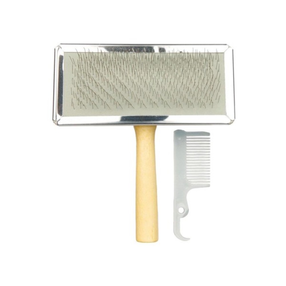 Особливості з дерев'яною ручкою; для делікатного догляду за шерстю й підшерстям; з хромованою основою щітки; дуже м'яка металева щетина; зі спеціальним пристроєм для очищення щітки