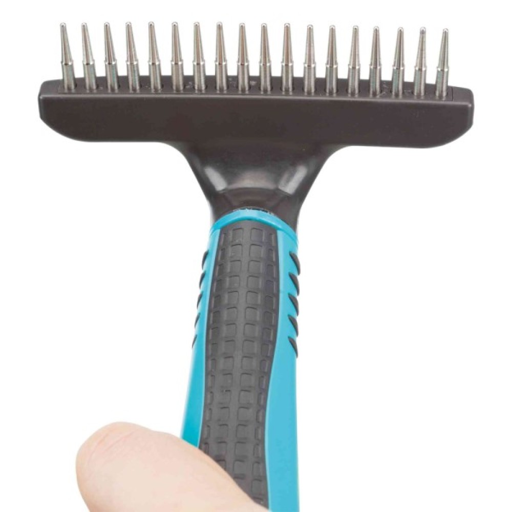 Гребінець-граблі Trixie з коротким зубом, що крутиться, призначена для делікатного догляду за шерстю завдяки заокругленим зубцям. Також можна використовувати для догляду за підшерстям.