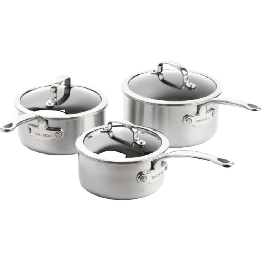 GreenPan Premiere 3-шаровий набір із 3 каструль із нержавіючої сталі з антипригарним покриттям. Цей набір каструль, що входить у високотехнологічну колекцію Premiere від GreenPan, складається з каструлі 16 см з кришкою, каструлі 18 см з кришкою та каструлі 20 см з кришкою та виготовлений з професійної 3-шарової нержавіючої сталі з алюмінієвою серцевиною для забезпечення оптимального розподілу.