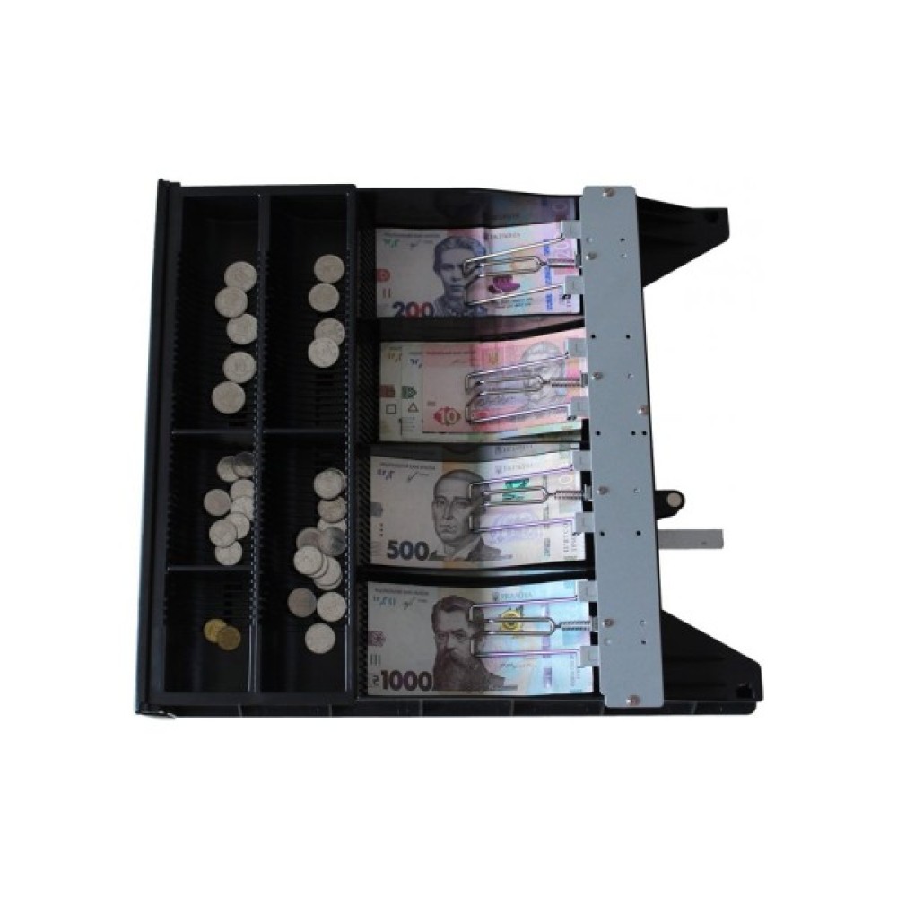 Конструкція відділень для монет і купюр дає змогу змінювати їхню ширину, завдяки чому можна легко розміщувати купюри та монети будь-якого номіналу. На передній панелі висувної частини розташовується проріз для вкидання купюр і документів. Банкноти надійно притискаються пружними металевими механізмами. Ящик має замок на три положення ключа — закрито, відкриття за командою від інтерфейсу RJ12 (фіскальний реєстратор, принтер, каса), відкриття вручну.