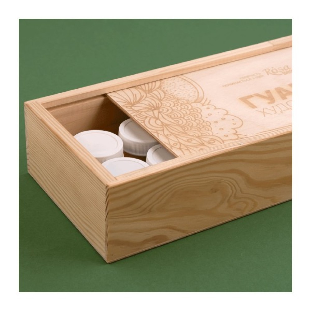 До складу набору входить 12 фарб в банках по 20мл: білила титанові, жовта світла, вохра натуральна, червона, червона темна, фіолетова, ультрамарин, синя темна, зелена світла, зелена темна, коричнева темна, чорна.