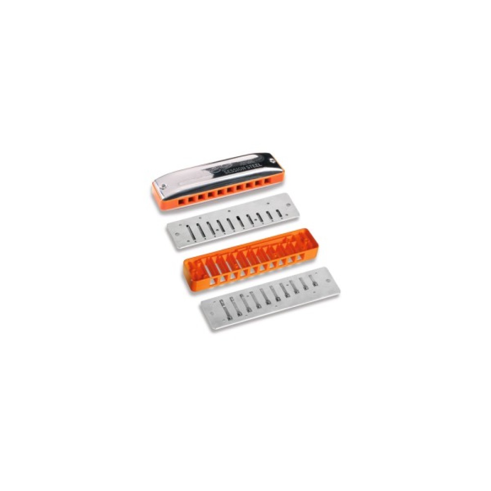 Блюзова гармоніка зі стійкими до корозії язичками з нержавіючої сталі, ергономічними кришками і пластиковим корпусом.