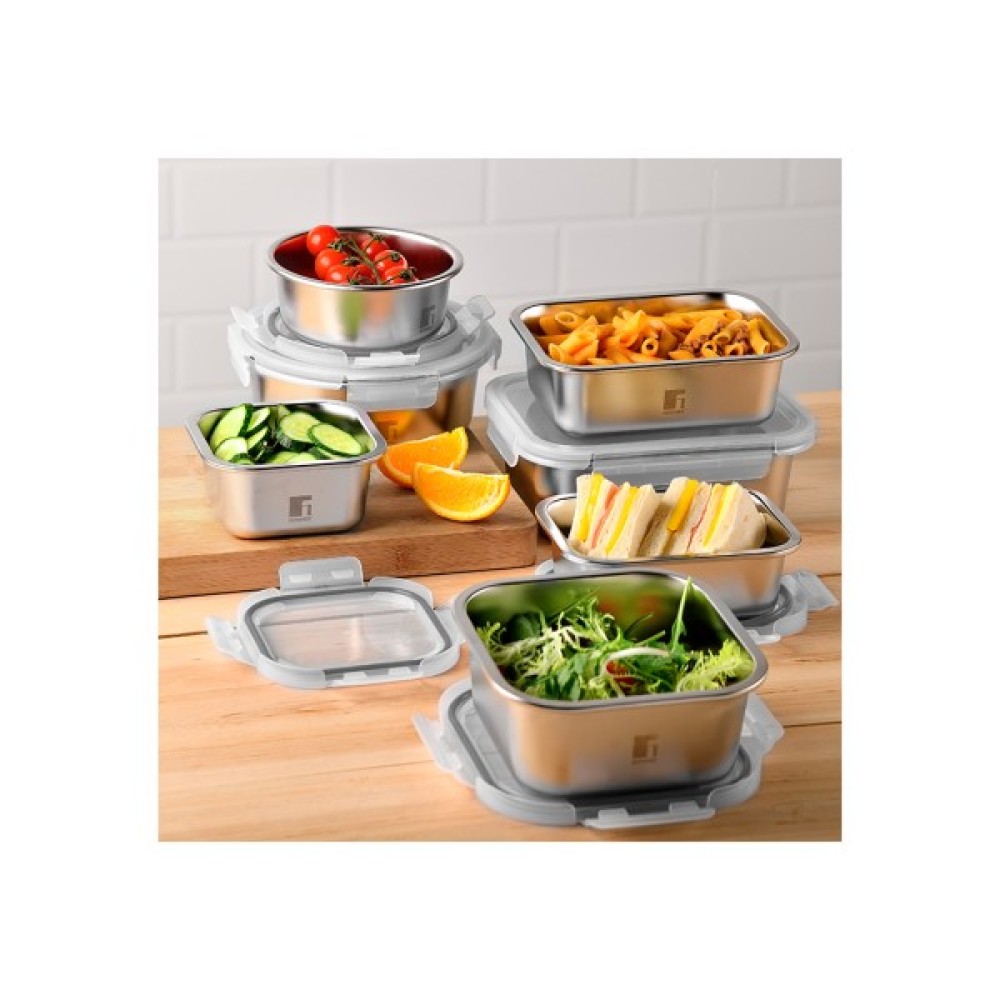 Цей прямокутний контейнер Bergner Go Lovers для продуктів ідеально підходить для щоденного використання - вдома, на роботі або в дорозі. Він поєднує в собі міцний матеріал із неіржавкої сталі з функціональною кришкою, що добре закривається, завдяки чому ваші продукти довше залишаються свіжими та безпечними. Об'єм: зручний розмір для обідів, вечерь або великих порцій салатів і гарнірів. Корпус із нержавіючої сталі - міцний, гігієнічний, стійкий до плям і запахів. Кришка виготовлена з поліпропілену (PP) і оснащена силіконовим кільцем ущільнювача сучасного сірого відтінку - кришка щільно прилягає і запобігає протіканню рідини. Чудово підходить для холодильника, для перенесення продуктів або як елегантне рішення для приготування їжі. Знімна кришка рекомендується для повторного розігрівання. Легко миється, рекомендується ручне миття для збереження герметичності та естетики. Елегантний, функціональний і практичний - цей контейнер стане ідеальним рішенням для тих, хто шукає сучасний спосіб зберігання продуктів без компромісів.