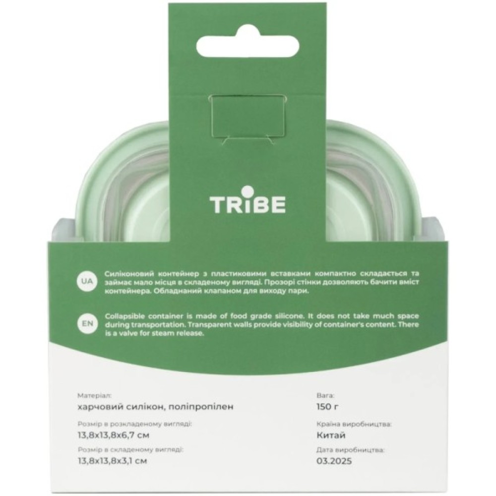 Tribe Collapsible Container – силіконовий контейнер з пластиковими вставками, який компактно складається та займає мінімум місця у складеному вигляді. Прозорі стінки дозволяють бачити вміст контейнера. Обладнаний клапаном для виходу пари.