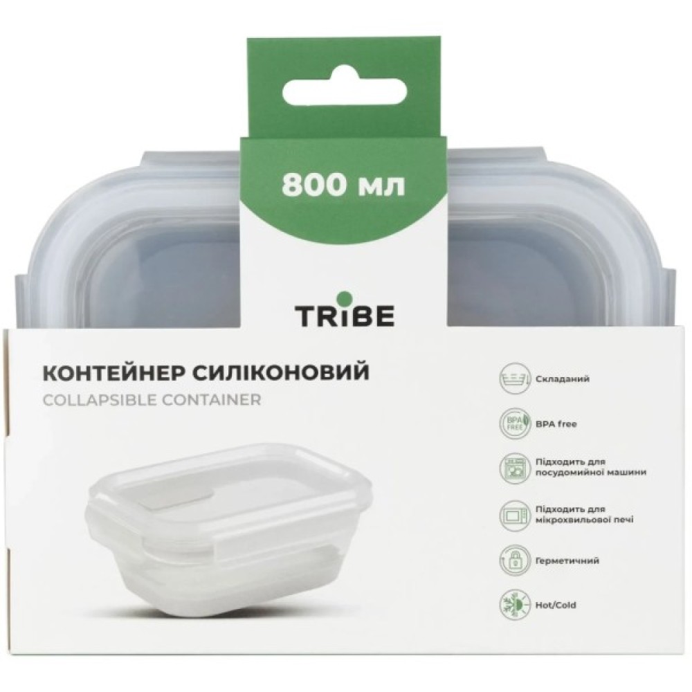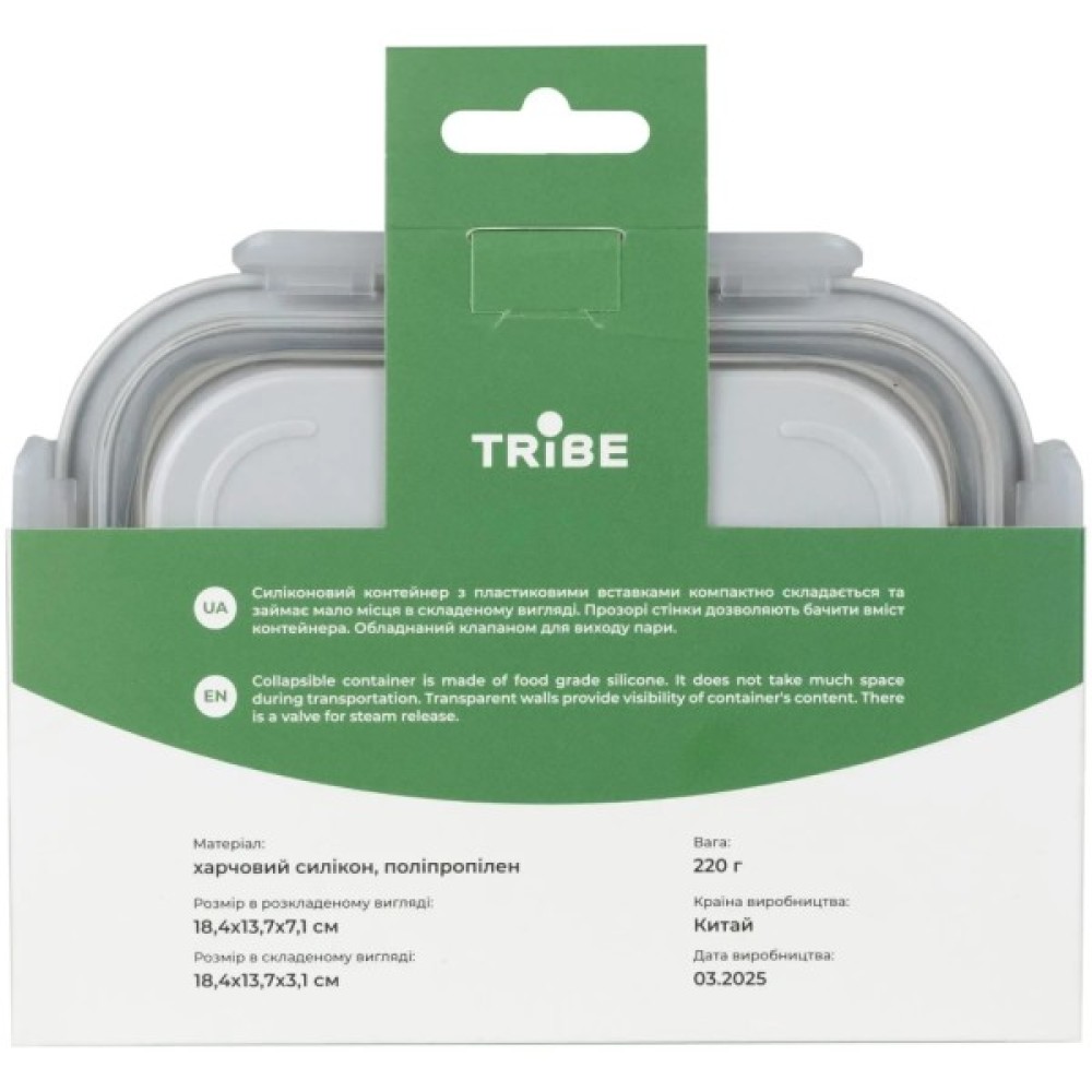 Tribe Collapsible Container – силіконовий контейнер з пластиковими вставками, який компактно складається та займає мінімум місця у складеному вигляді. Прозорі стінки дозволяють бачити вміст контейнера. Обладнаний клапаном для виходу пари.