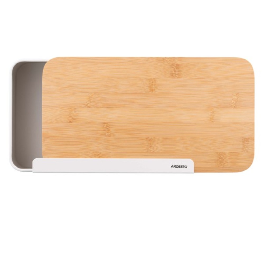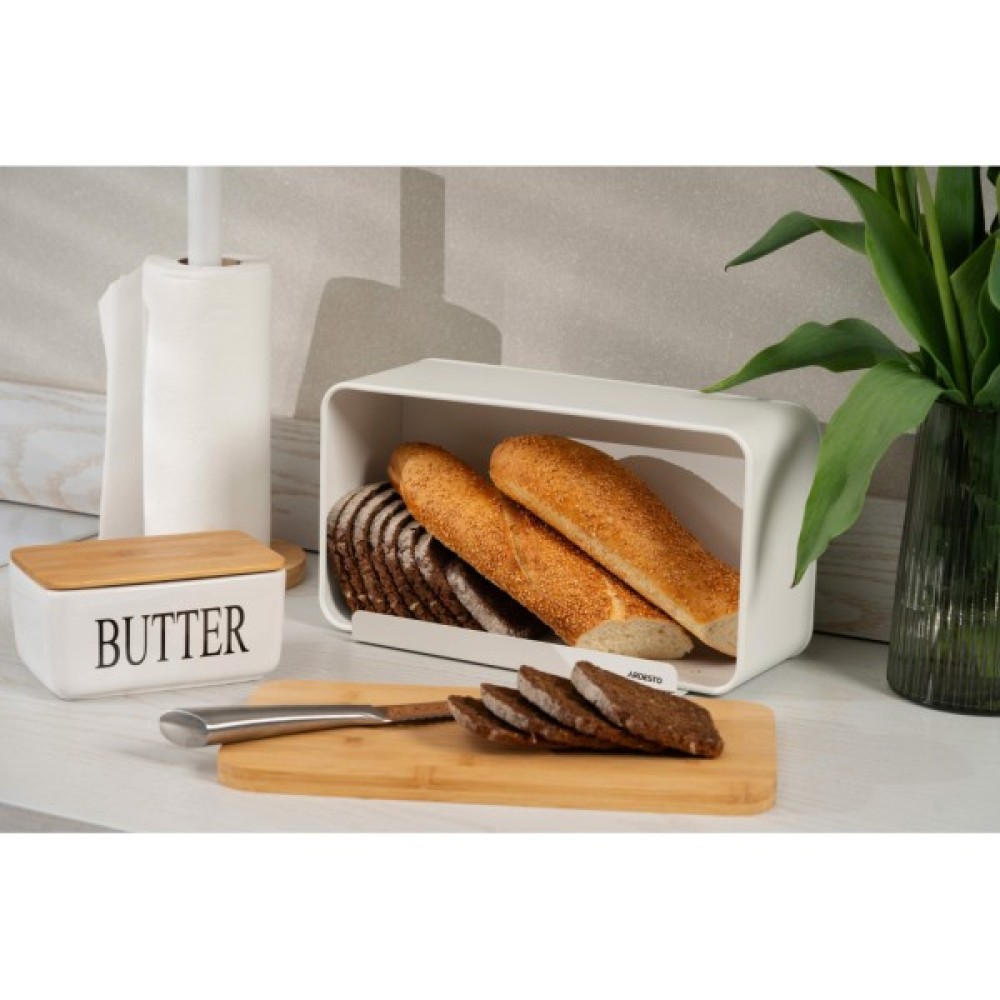 У хлібниці ARDESTO Midori хлібобулочні вироби залишаться свіжими надовго, вона запобігає висиханню та захищає від вологи. Конструкцію прямокутної форми розміром 33 х 13 х 18 см виготовлено з металу білого кольору та доповнено бамбуковими стінками, тож вона вдало пасуватиме чи не на будь-якій кухні. Доглядати за виробом нескладно, проте не рекомендовано мити в посудомийній машині.