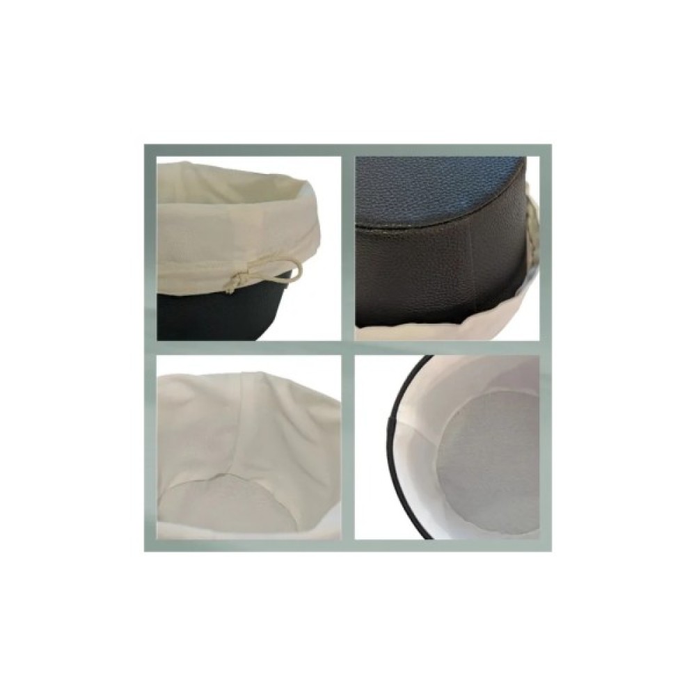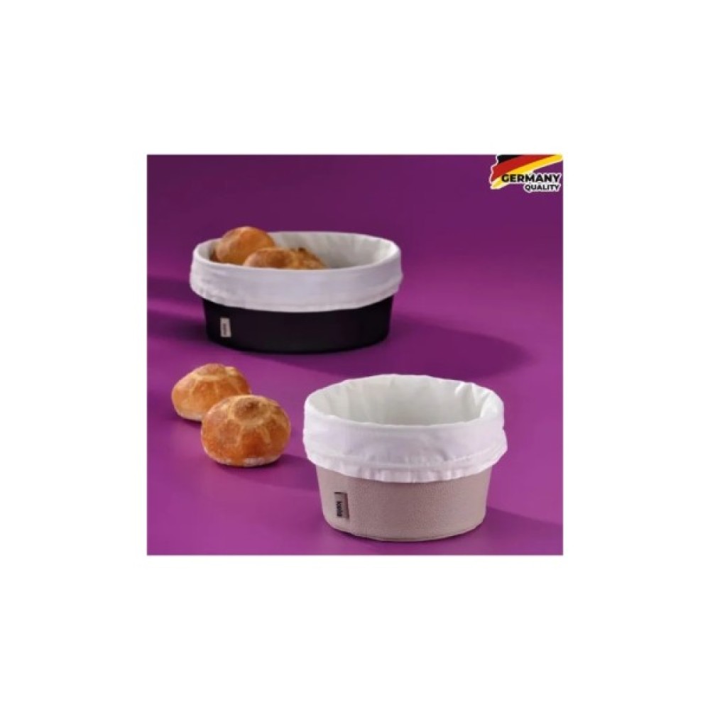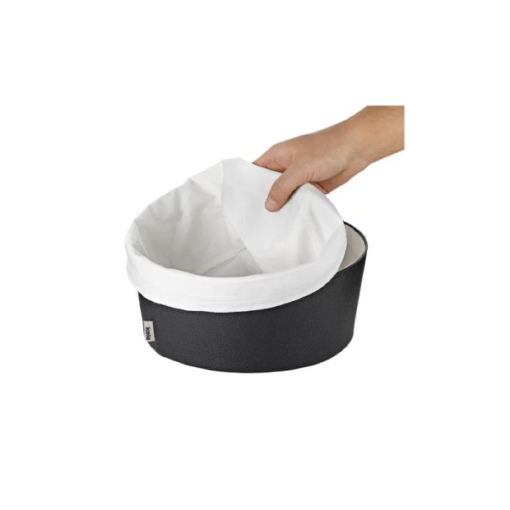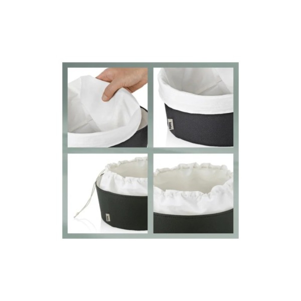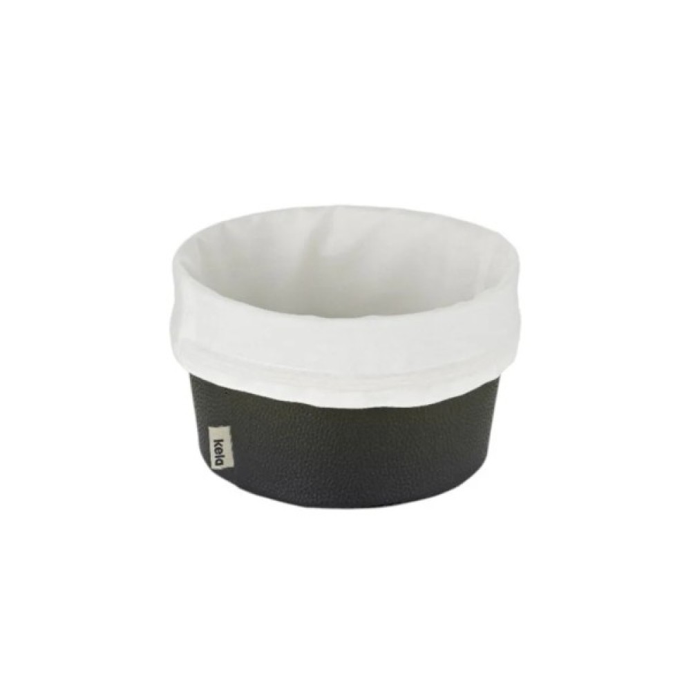 Кошик KELA Grana для хліба та булочок виготовлена зі штучної шкіри з бавовняним мішечком усередині. Цей мішок можна прати при 30°C, і його можна затягнути шнурком. Мішечок також захищає випічку від висихання. Приємна деталь: контраст мішка з її білою внутрішньою частиною та темнішою зовнішньою частиною з ПУ шкіри. Хлібниця KELA Grana доступна в різних розмірах та кольорах. Розміри: 19 см, висота 11 см. Колір: чорний.