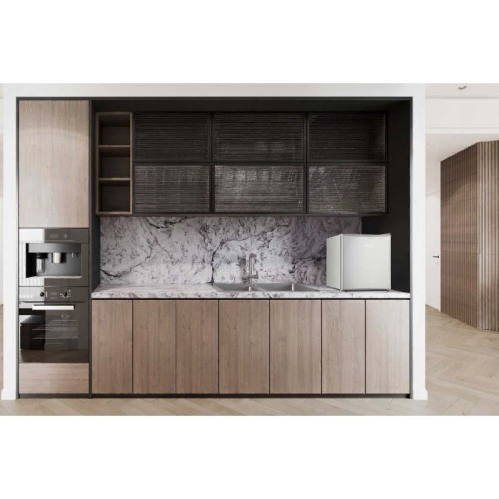 Внутрішній простір холодильника організовано з урахуванням максимальної зручності. Корисний об'єм холодильної камери складає 43 літри, де можна ефективно розмістити найважливіші продукти. На дверцятах передбачено дві зручні корзини для напоїв, банок та інших дрібних продуктів, а полиця для пляшок розташована у дверях для зберігання улюблених напоїв.