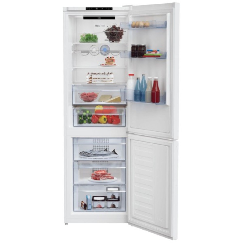 Beko RCNA366I30W має загальний об'єм 324 літри з розділеними просторами для охолодження та заморожування. У ньому передбачено No Frost у кожному відділенні, що забезпечує автоматичну розморожування і зберігає надовго свіжість продуктів. Холодильна камера має корисний об'єм 215 літрів, оснащена трьома міцними полицями і трьома дверними корзинами для зручного розподілу продуктів. Особливою перевагою є підвісна полиця для пляшок, що дозволяє легко зберігати напої.