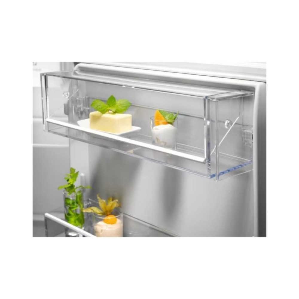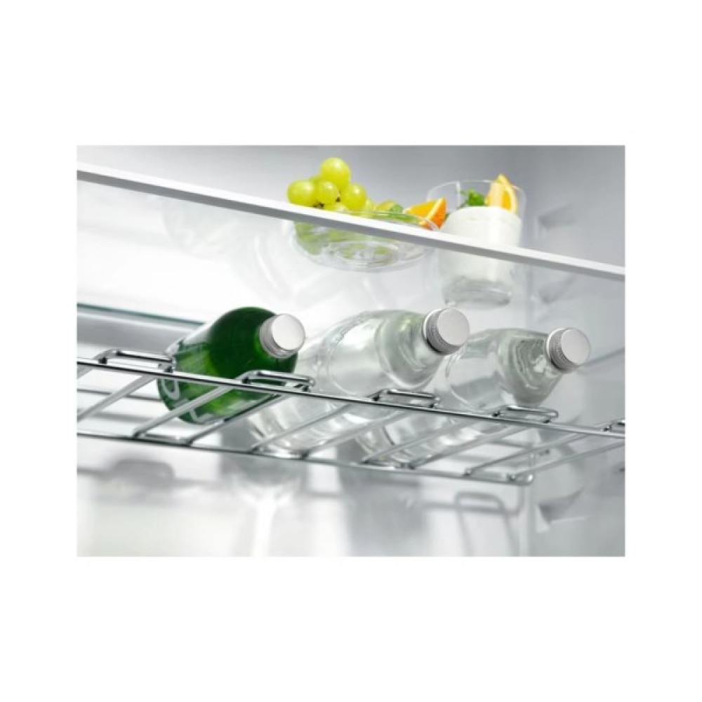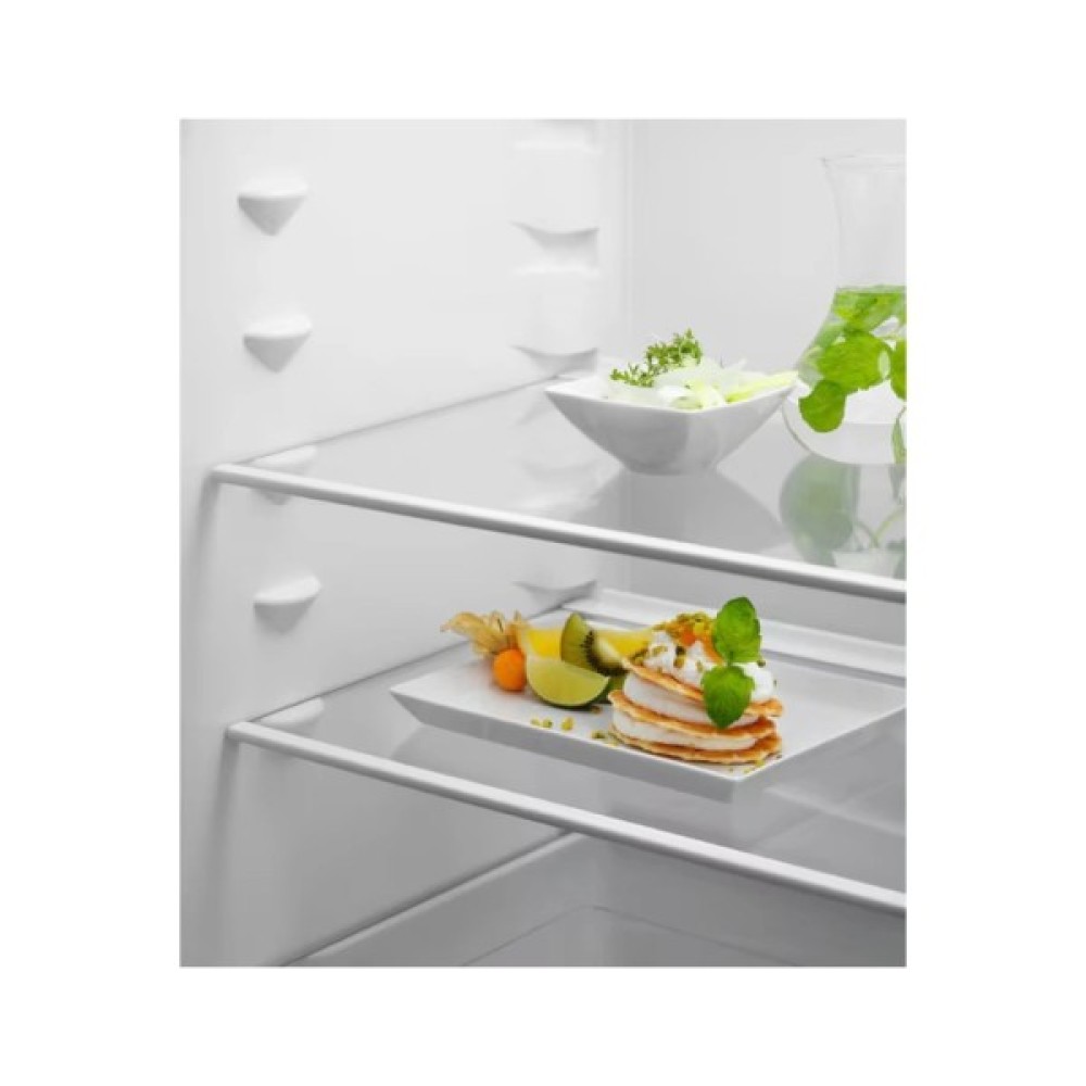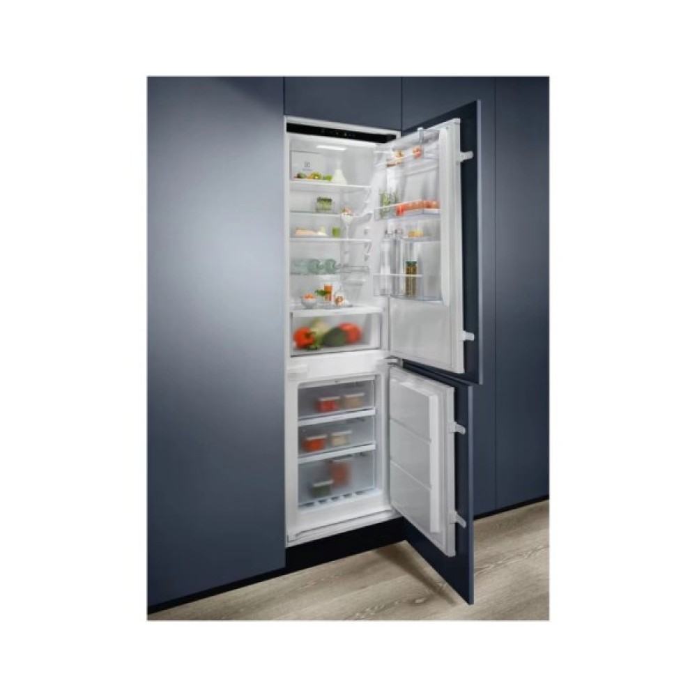 Вбудований холодильник Electrolux LNG7TE18S з нижньою морозильною камерою оснащений розсувним кріпленням фасаду для повної інтеграції. Корисний об'єм становить 253 л (192 л холодильна камера та 61 л морозильна). Технологія TwinTech No Frost забезпечує роздільне охолодження камер без утворення інею в морозильнику. Ящик GreenZone зберігає вітаміни в овочах та фруктах завдяки контролю вологості. Інверторний компресор характеризується тихою роботою, функції Action Cool та Action Freeze підтримують швидке охолодження та заморожування.