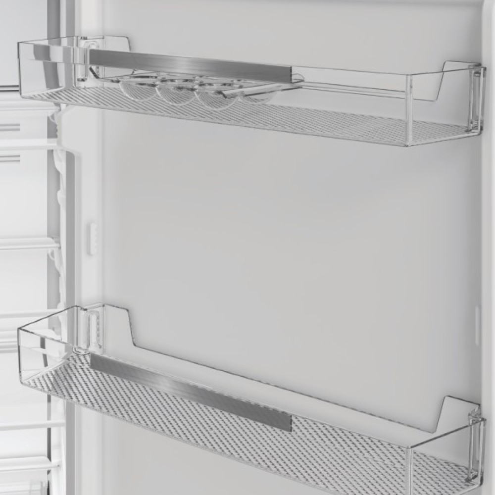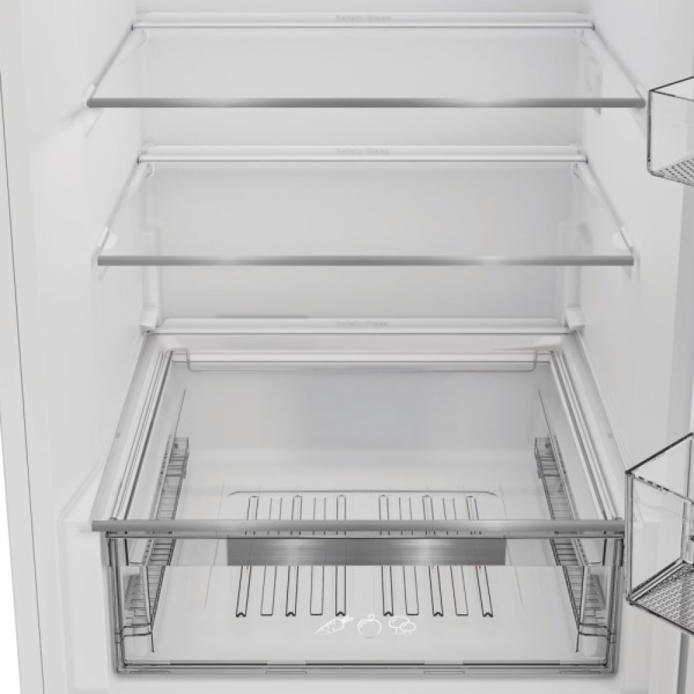 З загальним об'ємом 386 літрів, холодильник пропонує величезний простір для вашої родини. Холодильна камера об'ємом 266 літрів дозволяє організувати продукти на п'яти полицях із загартованого скла, які вирізняються високою стійкістю до навантажень. Чотири дверні корзини забезпечують додаткове зручне місце для різних дрібниць. Вбудована зона свіжості допоможе максимально зберегти ніжні продукти, такі як зелень та фрукти, свіжими і поживними.