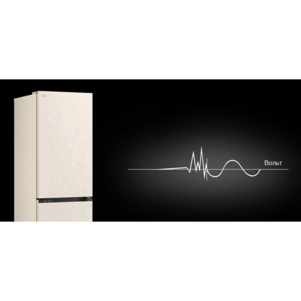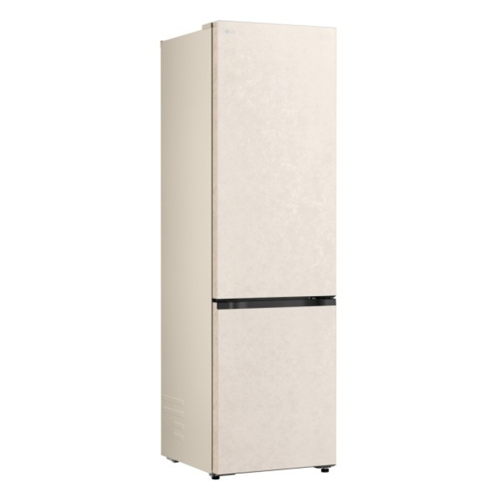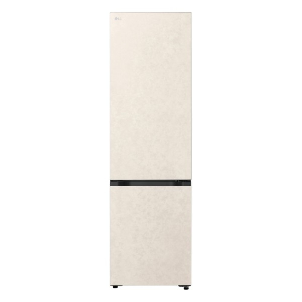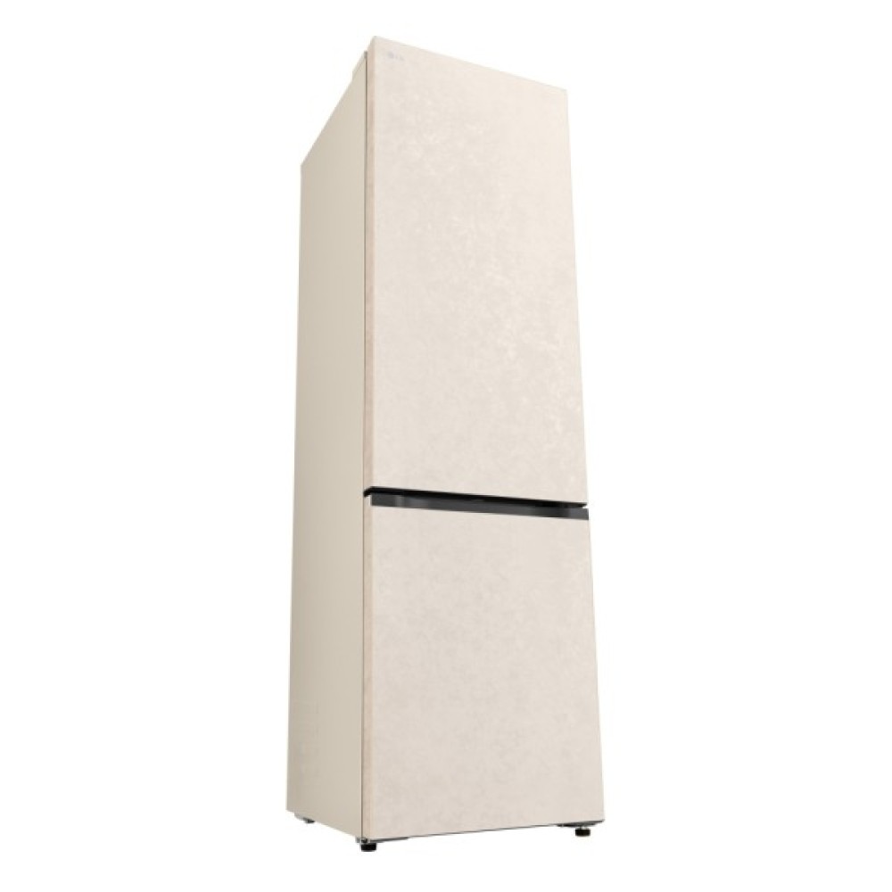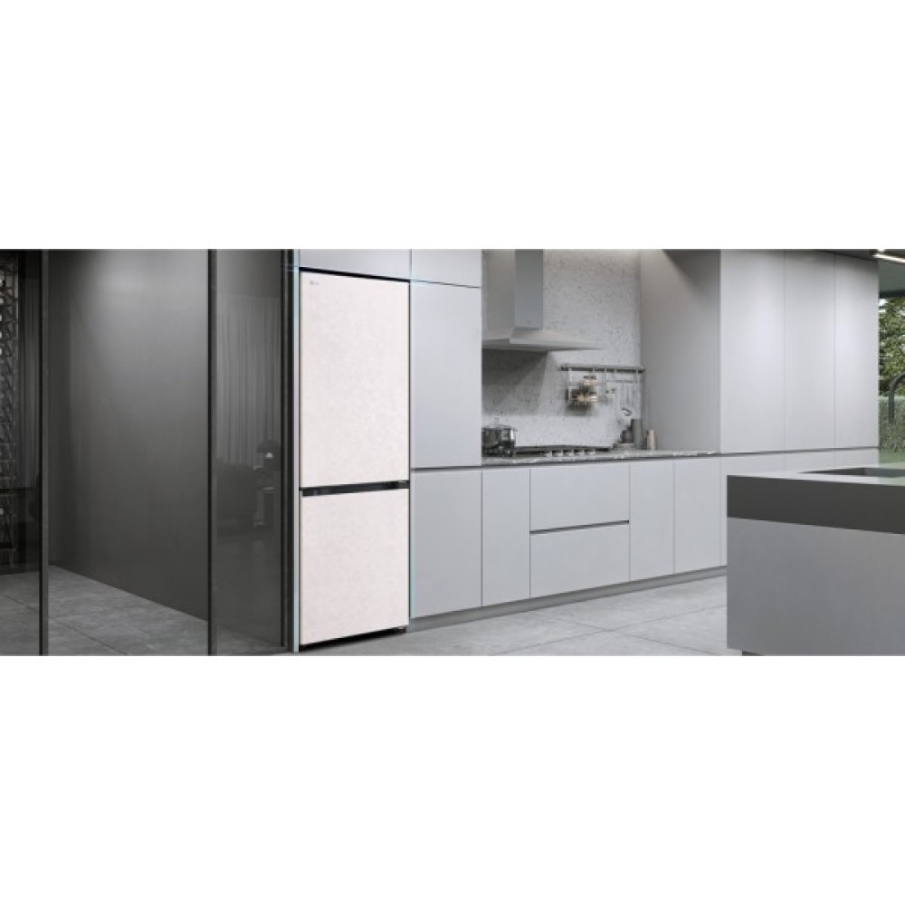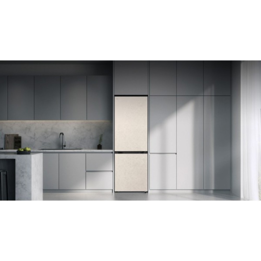 Холодильник LG GC-B509EESM з нижньою морозильною камерою має корисний об’єм 375 л (262 л холодильне + 113 л морозильне відділення) і належить до енергетичного класу E. Інверторний компресор забезпечує тиху роботу на рівні 35 дБ та потужність заморожування до 10 кг на добу. Система Total No Frost усуває потребу в розморожуванні, а Metal Fresh разом із зонами Fresh Converter та Fresh Balancer дозволяють підтримувати оптимальні умови для різних типів продуктів. Бежевий матовий колір корпусу та прихована горизонтальна ручка створюють м’який, нейтральний вигляд.