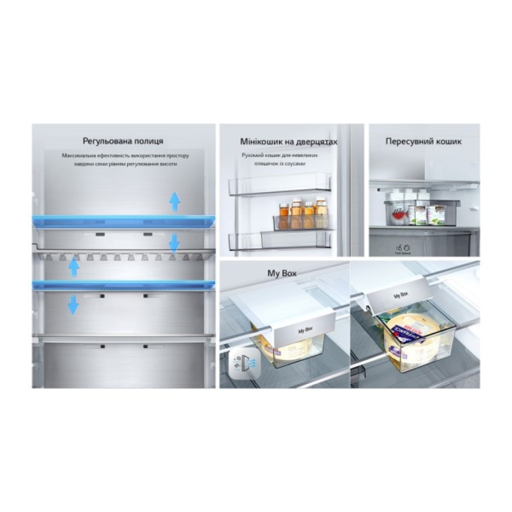 Додатково led-освітлення; технологія контролю напруги; експрес заморозка; антибактеріальний ущільнювач bio shield; перенавішування дверей; сигнал відкритих дверцят; багатопотокова система охолодження multi air flow; нульовий зазор; металеве декорування полиць та ящиків; режим економії електроенергії eco friendly; винна полиця; doorcooling+; лоток для заморожування льоду; металева задня стінка metal fresh; міні кошик на дверцятах; пересувний кошик; висувний контейнер для дрібної їжі my box; складана полиця; lg thinq з керуванням через wi-fi; інтелектуальна система діагностики smart diagnosis; кришка для підтримки оптимальної вологості