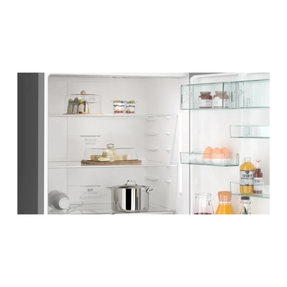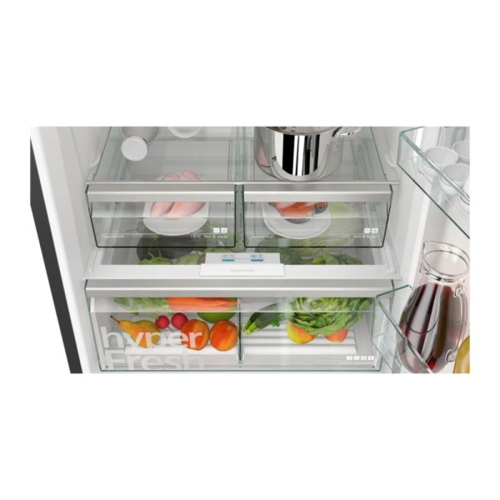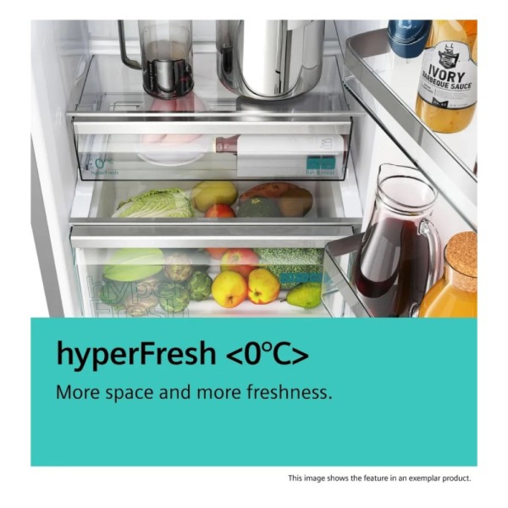 Потужне внутрішнє світлодіодне освітлення та фільтр з активованого вугілля FreshAir забезпечують не лише якісне освітлення, але й чистоту повітря всередині камери. Додатковий великий бокс hyperFresh стане знахідкою для тих, хто цінує свіжість фруктів і овочів.