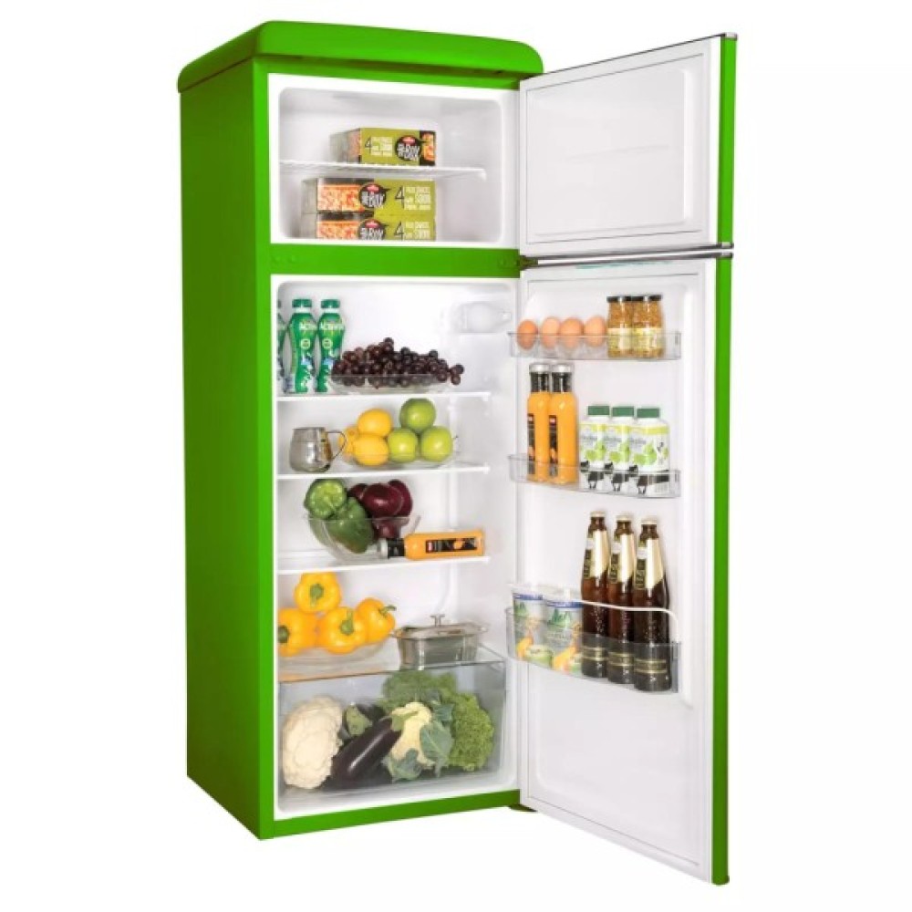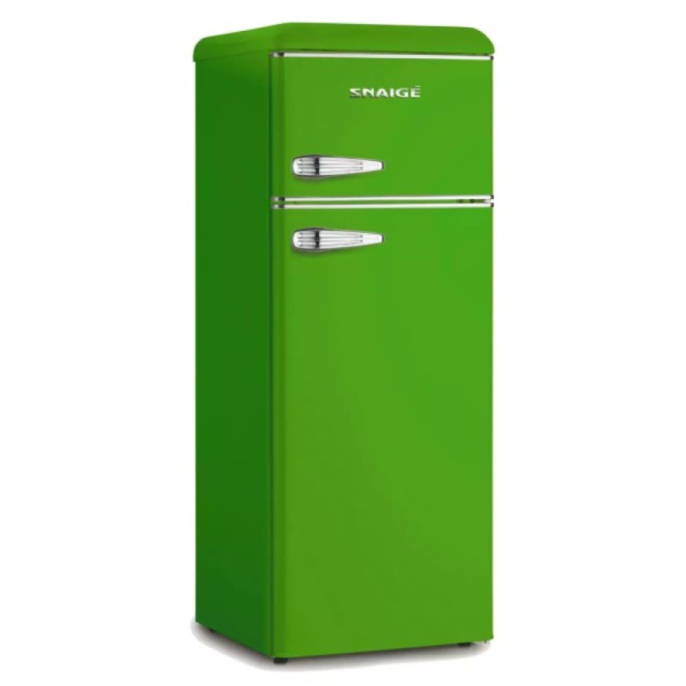 Холодильник Snaige FR24SM-PRDG0E з верхньою морозильною камерою має об’єм 209 л нетто (166 л холодильне відділення + 47 л морозильне) та клас енергоефективності E. Ретро-дизайн у зеленому кольорі з сріблястими дверними планками робить його акцентним елементом кухні. Статична система охолодження з одним компресором забезпечує стабільну температуру +4 °C у холодильному відділенні та -18 °C у морозильному. Пристрій витримує підвищення температури до 12 годин без електрики. Рівень шуму становить 39 дБ (клас C), що робить його комфортним для побутового використання.