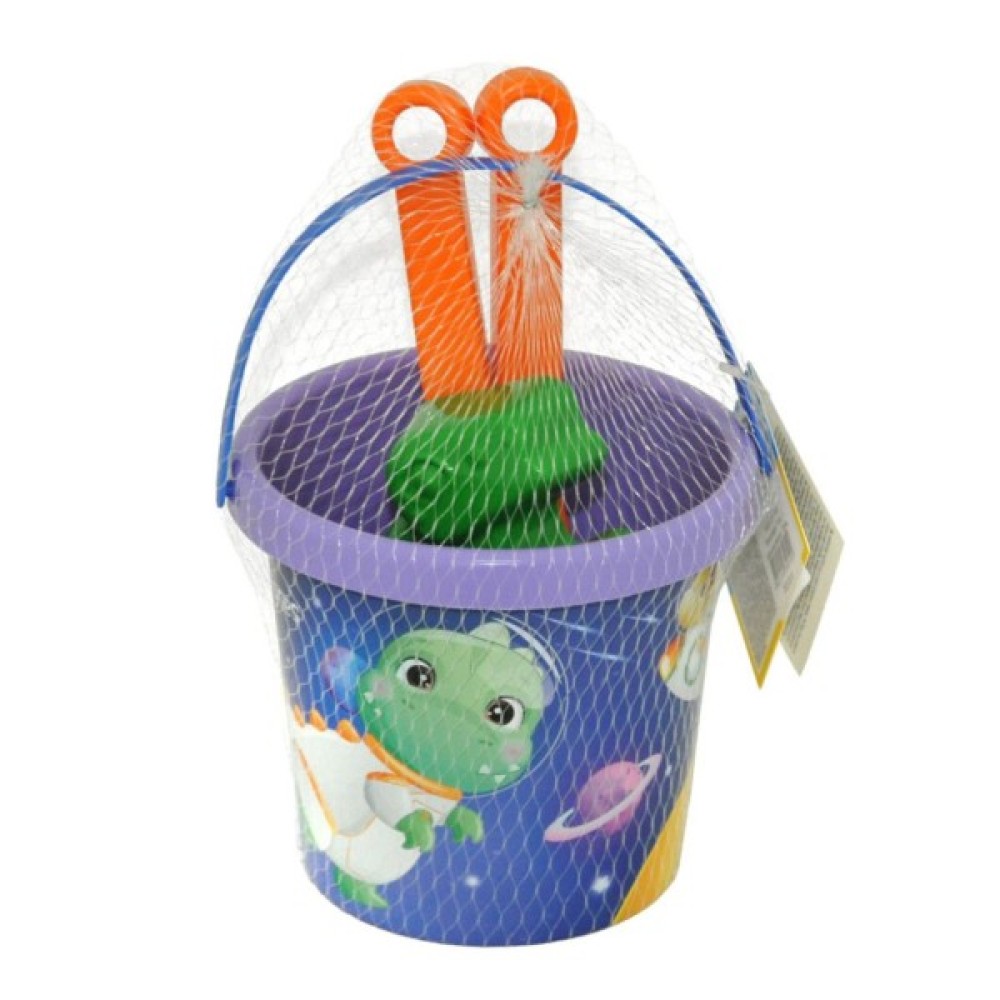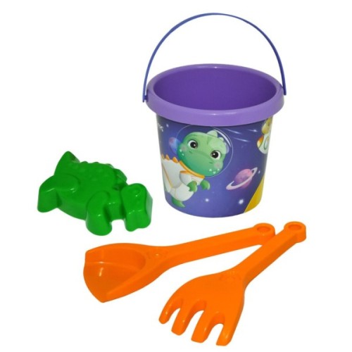 До набору входять: відеречко ємністю 1 л, лопатка, граблі та формочка динозавр.