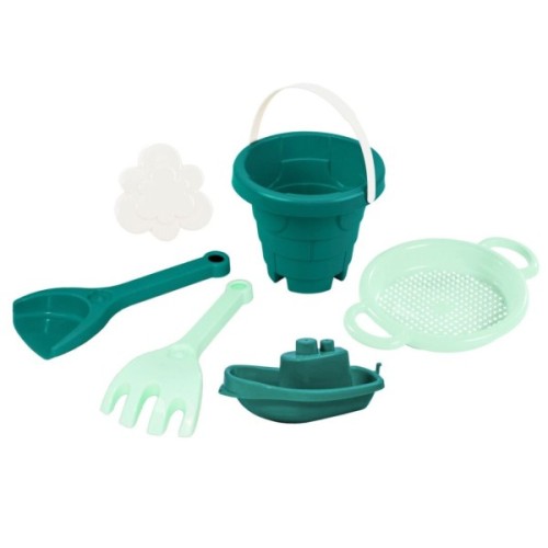 Набір для піску «Вежа» - ідеальний вибір для ігор у піску і воді. До набору входить 6 елементів: лопатка, грабельки, 1 формочка, кораблик, ситечко і відерце у вигляді вежі замку. Ігри набором розвивають  уяву і творче мислення, рухову активність дітей, сприяють покращенню зорово-рухової координації, а також спонукає до комунікації з іншими дітьми. Іграшки виготовлені в трендових кольорах 2021 року.