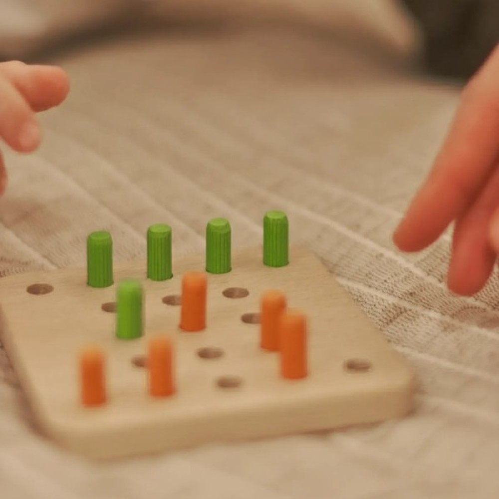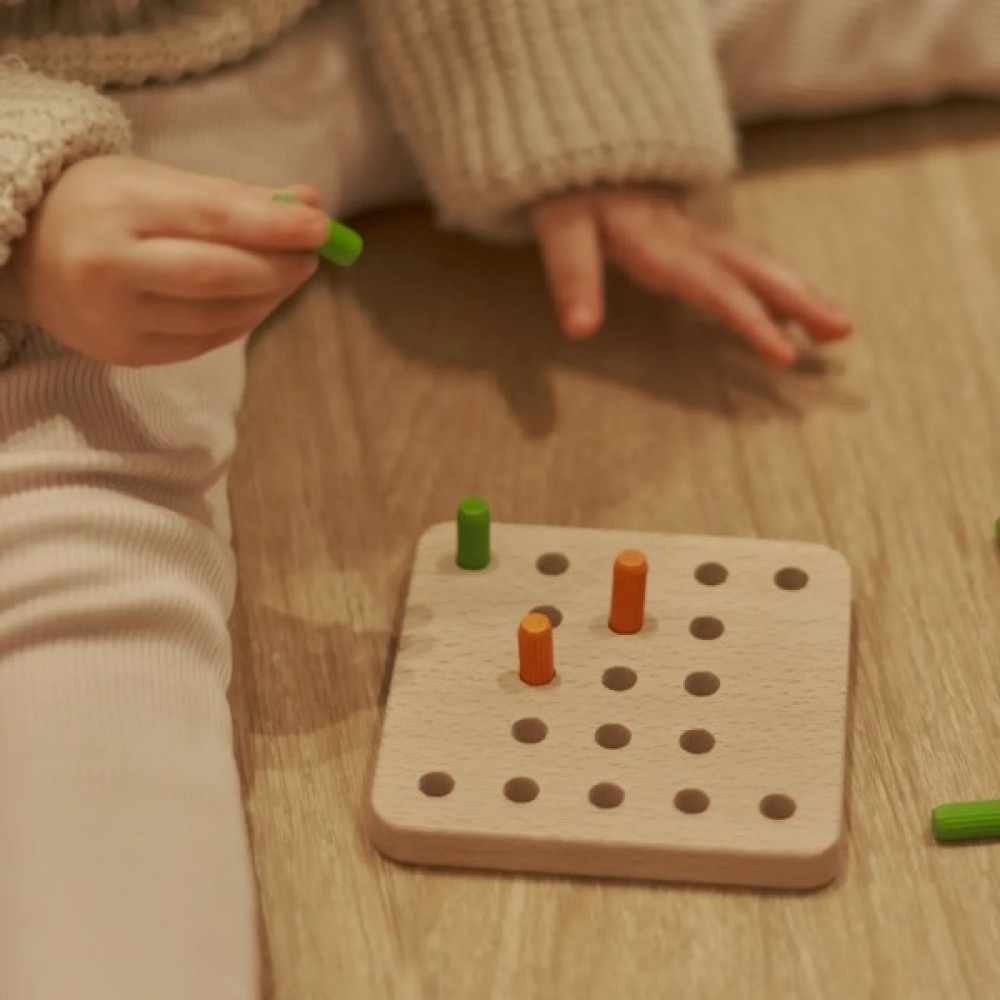 Ігрове поле розміром 11 х 11 см забезпечує зручність і компактність, а фішки, виготовлені з натурального дерева і розфарбовані акриловою фарбою на водній основі, є абсолютно безпечними для дітей, завдяки чому гра відповідає найвищим екологічним стандартам. Комплект налічує 10 фішок — 5 зелених хрестиків і 5 оранжевих нуликів, з якими діти можуть експериментувати, створюючи різноманітні комбінації.