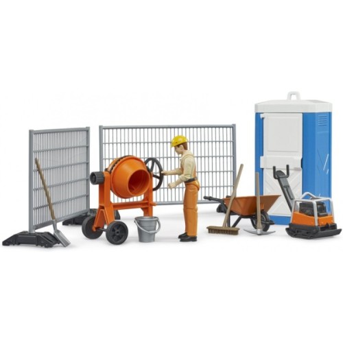 фігурка будівельника; огорожі; віброплита; розчинозсішувальна машина для будівельних робіт; тачка з інструментами та мобільний туалет