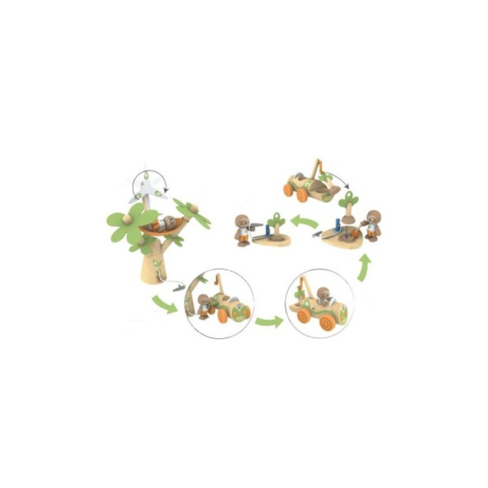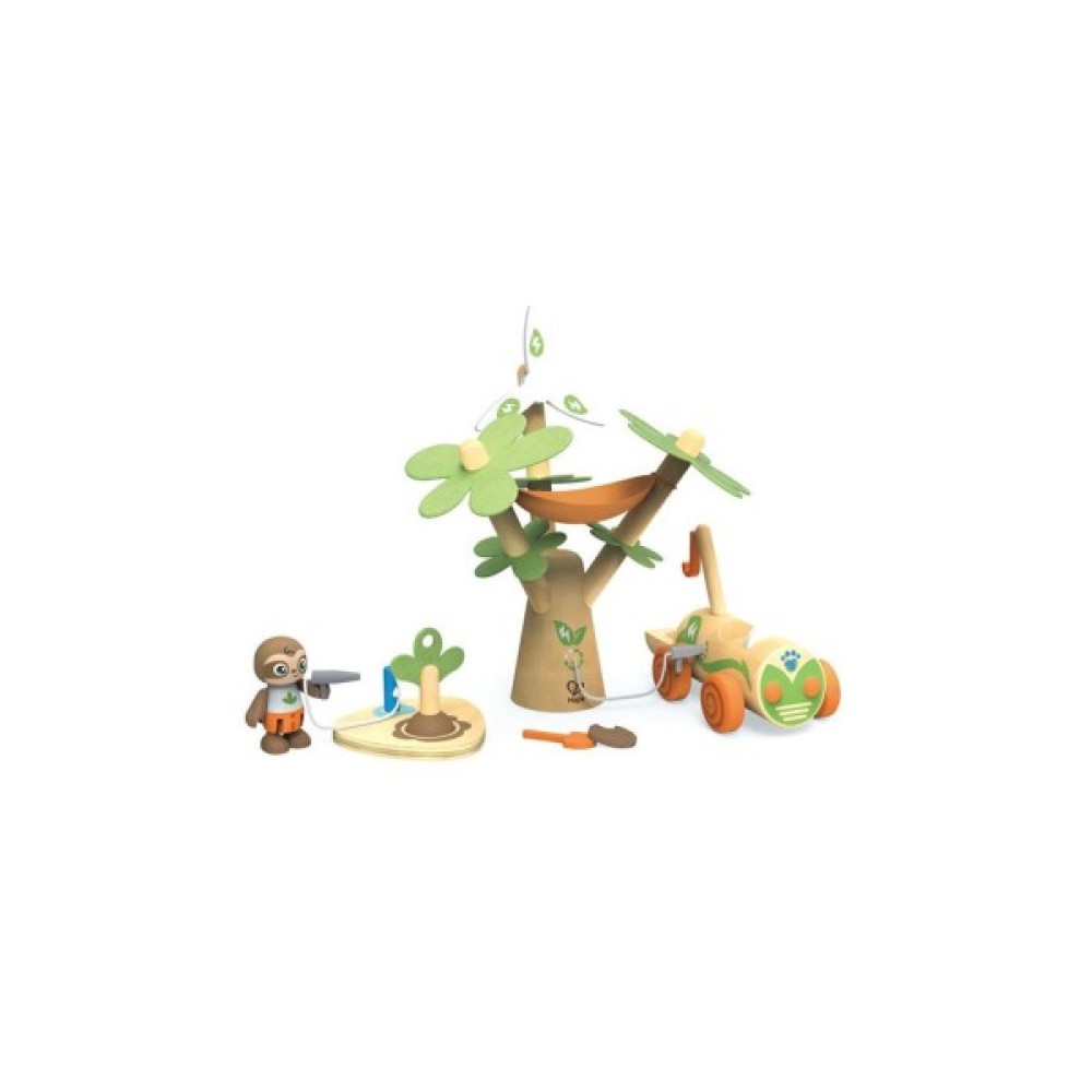 У високого дерева є вітряк, що обертається, який приводить в дію зарядний пристрій для автомобіля. Лінивець може розслабитися в гамаку, доки акумулятор заряджається. Іграшковий електромобіль має кран і гак, щоб підняти дерево ззаду, а лінивець може вирити ямку лопаткою. Посадіть дерево, а потім використовуйте водяний насос, щоб полити його.