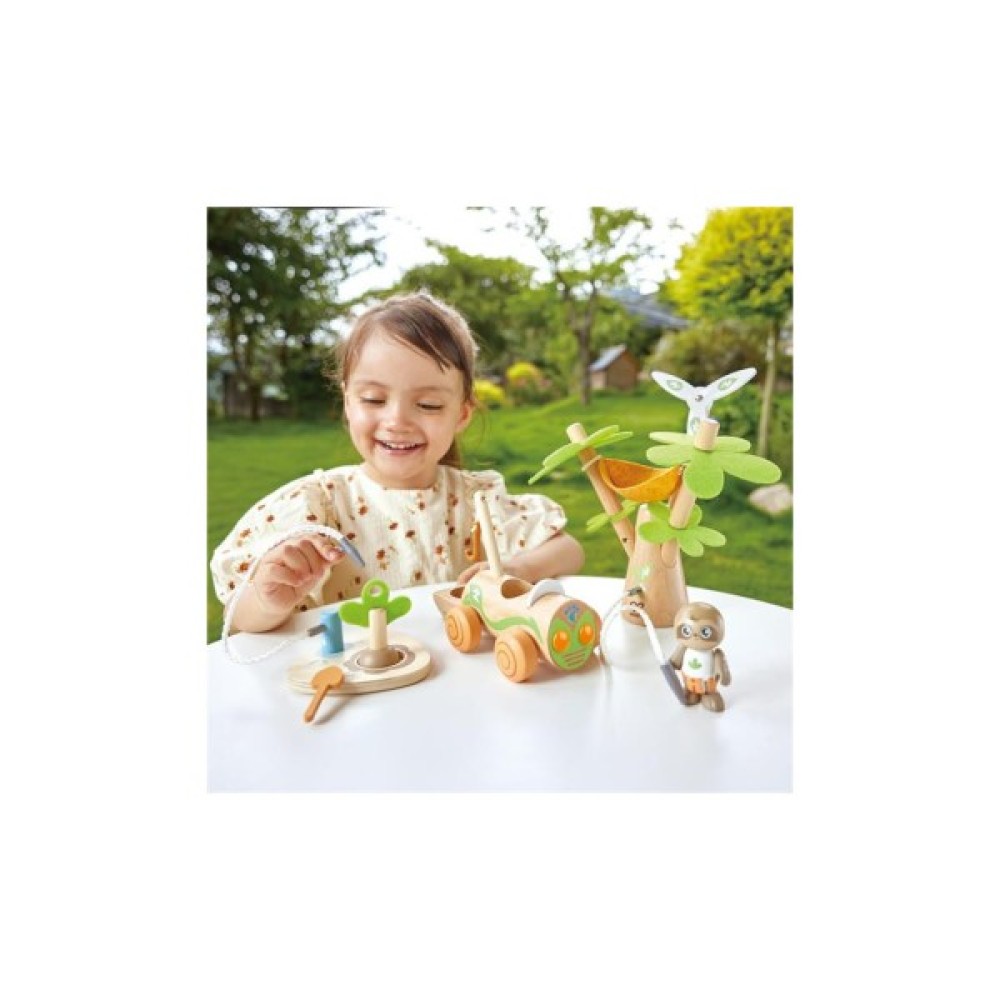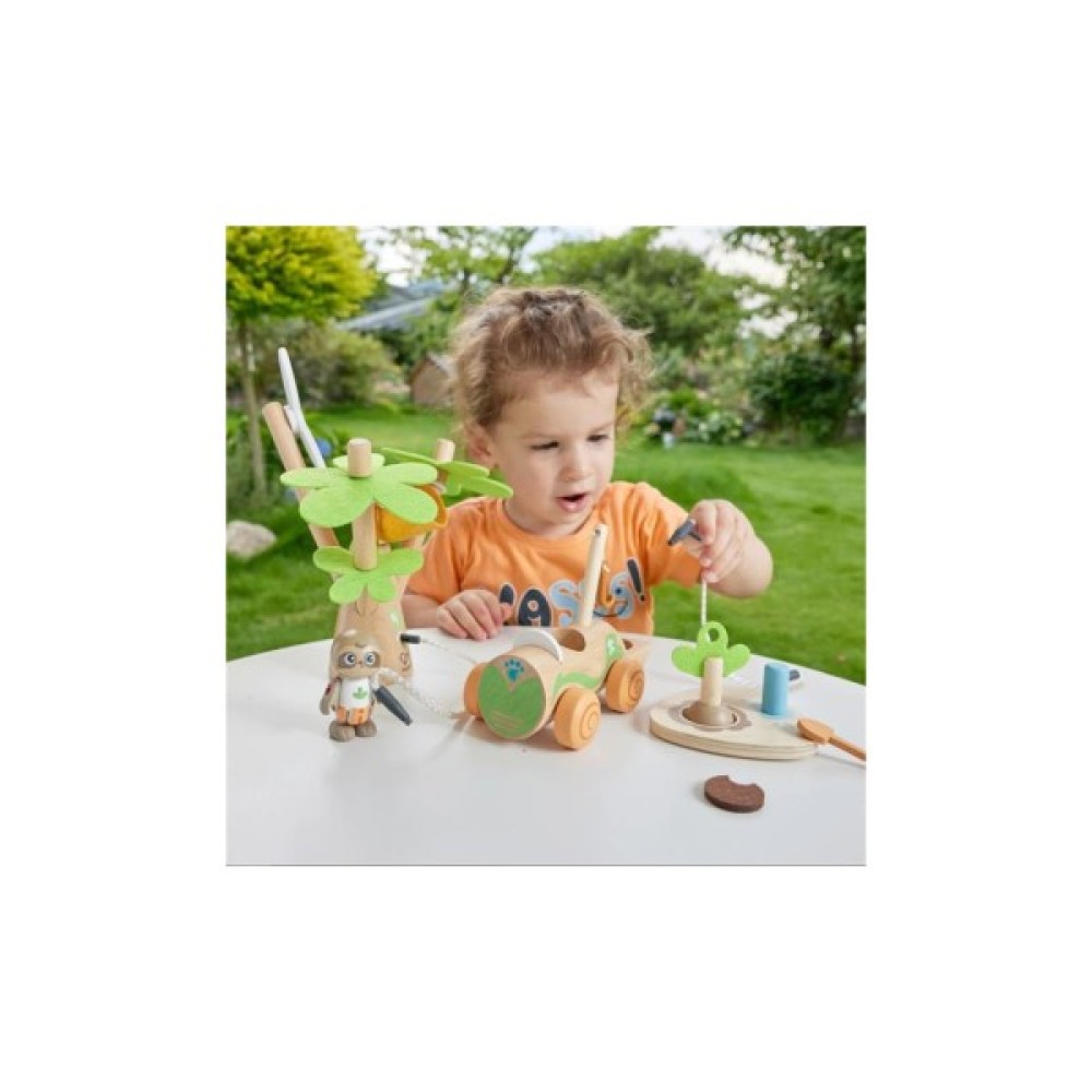 Дерев'яний набір Hape Електрокар для садіння дерев створений для дітей від 3 років. Він допоможе малюкам дізнатися про важливість довкілля. У наборі є фігурка лінивця, електромобіль, вітряна турбіна та набір для садіння дерев.