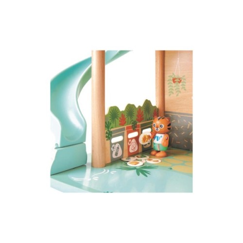 Дворівневий ігровий набір укомплектований повним набором меблів та аксесуарів – дві фігурки тигрів, ліжко, ванна, килимок для ванної, диван, журнальний столик, каструля, дві тарілки, дві чашки, плита, гірка та 18 карток із зображенням сміття для 3 сортувальних баків.