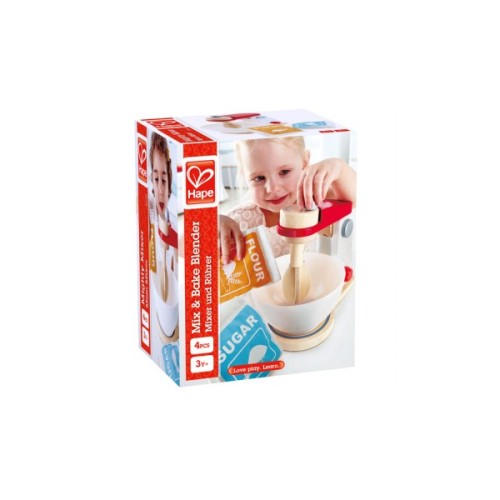 Іграшковий міксер Hape створений для дітей віком від 3 років. Не терпиться вирости і стати справжнім пекарем? Діти можуть імітувати випічку, використовуючи іграшкові пакети з борошном і цукром, миску та поворотний блендер. Ручка міксера обертається.