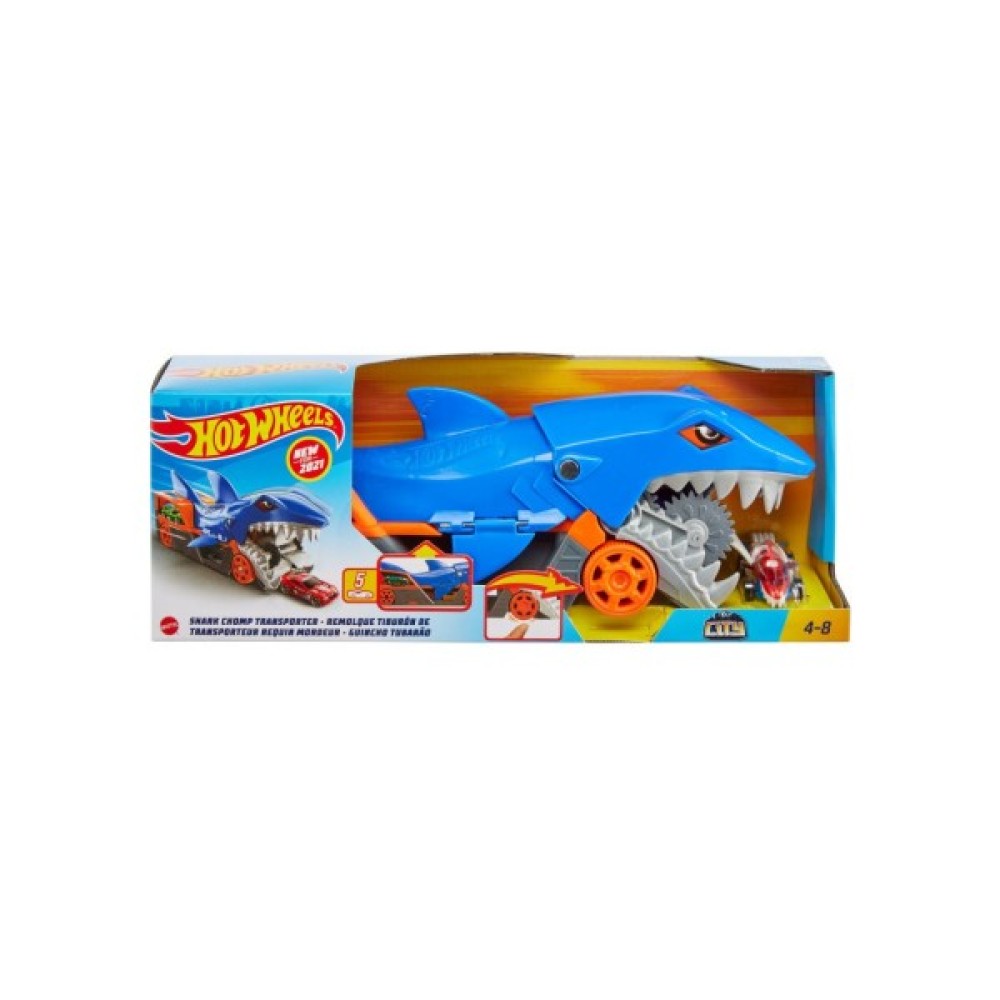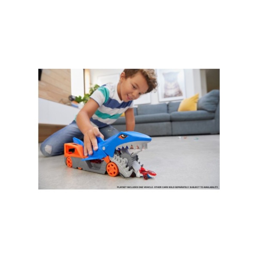 Вантажівка-транспортер Акуляча паща Hot Wheels — це перевтілення традиційної машинки Акулячий укус Hot Wheels на нову круту вантажівку. Завдяки спеціальному механізму, що запускається натисканням, акула хапає машинки щелепами, ковтає і зберігає їх у «животі».