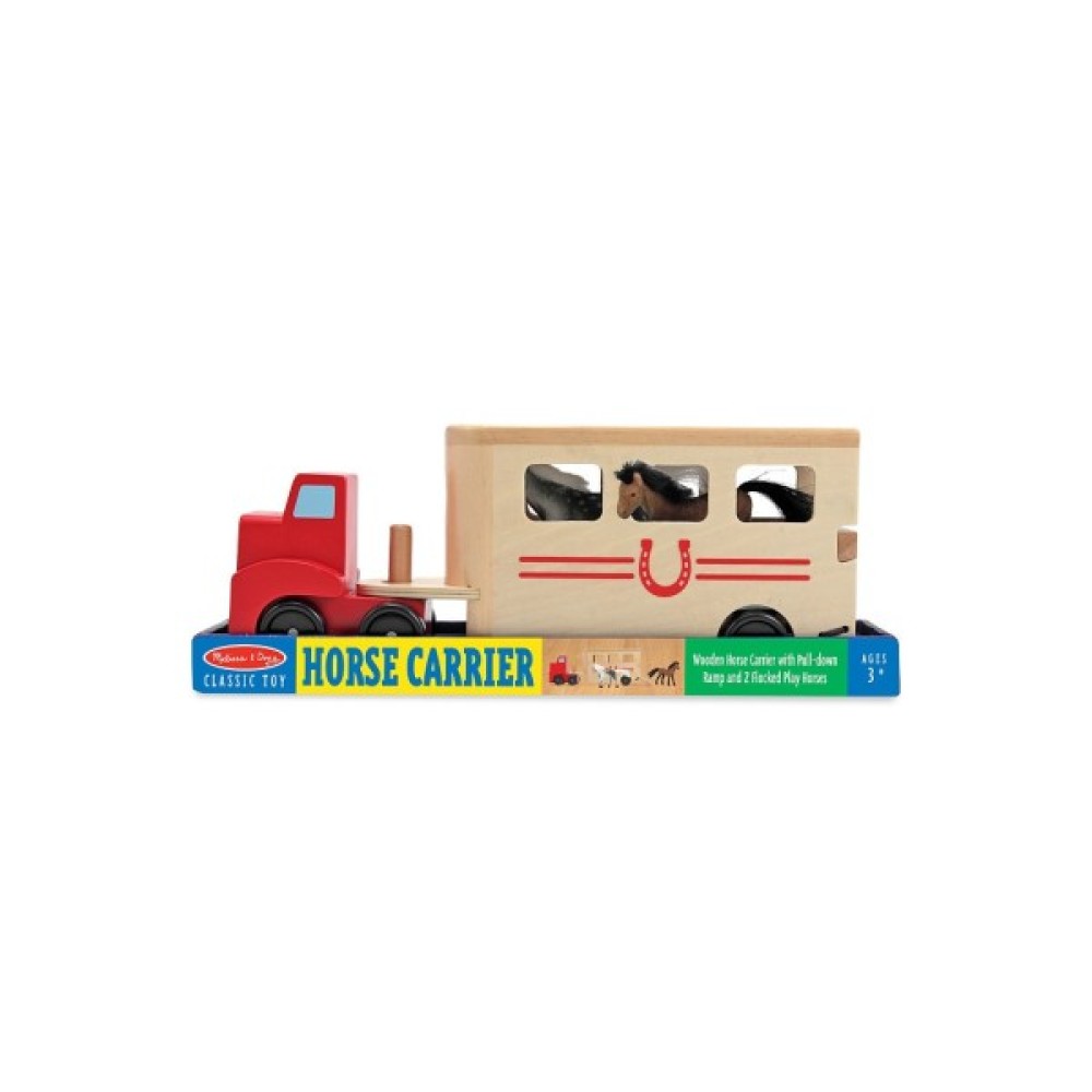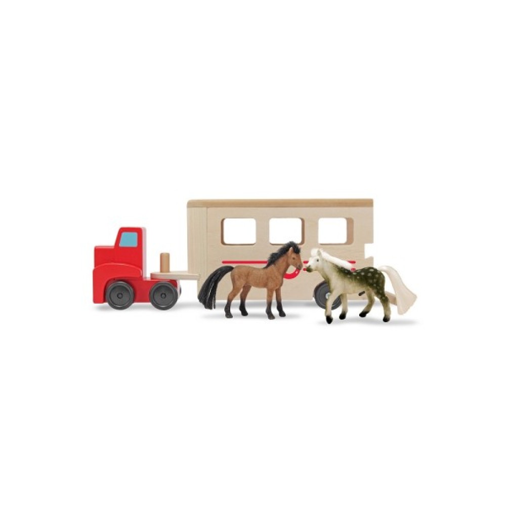 Завантажте двох зграйних коней у причіп цього великого дерев'яного транспортного засобу, і ви готові вирушати в дорогу! Коня для перевезення коней постачається з висувною пандусом, щоб коні могли легко завантажуватися та розвантажуватися. Чудово підходить для тонкої моторики, мови та удаваної гри.