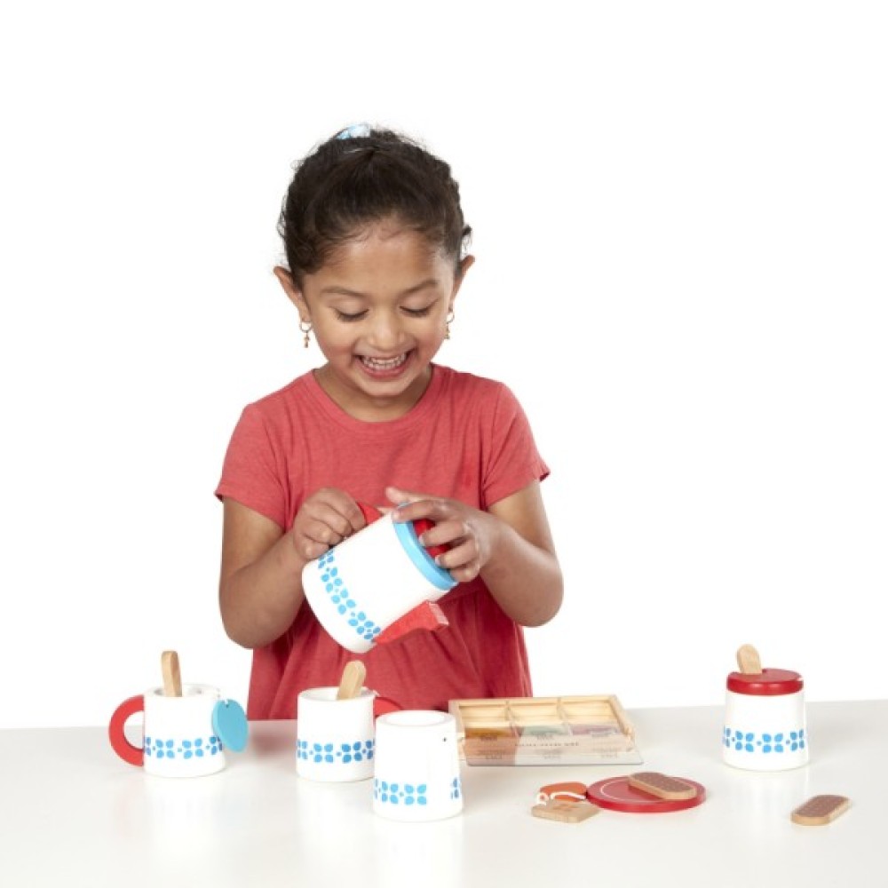 Дерев'яний набір "Чайний сервіз" призначений для двох персон, які хочуть влаштувати чаювання. У набір входить: чайник з кришкою, 2 чашки, глечик з молоком, цукорниця, 2 печива, 6 чайних пакетиків з різними сортами чаю, які знаходяться в окремій дерев'яній коробочці.