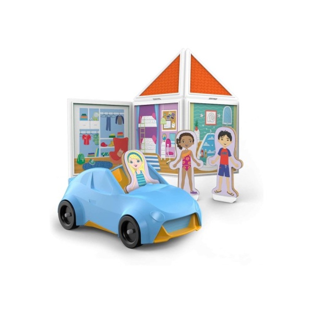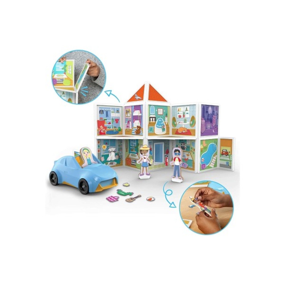 Ласкаво просимо додому! Створіть уявне місце для життя та гри за допомогою магнітного будівельного набору Magnetivity Наш дім! Заохочує дітей експериментувати, досліджувати та уявляти, надихаючи їх розробляти та будувати свої власні унікальні світи! 16 двосторонніх панелей з отвором з обох сторін магнітно прикріплюються в різних поєднаннях, тому діти можуть створювати нові конструкції для свого будинку та автомобіля. 80 магнітніх аксесуарів, прилипають до панелей та трьох магнітних ігрових фігур з підставками.