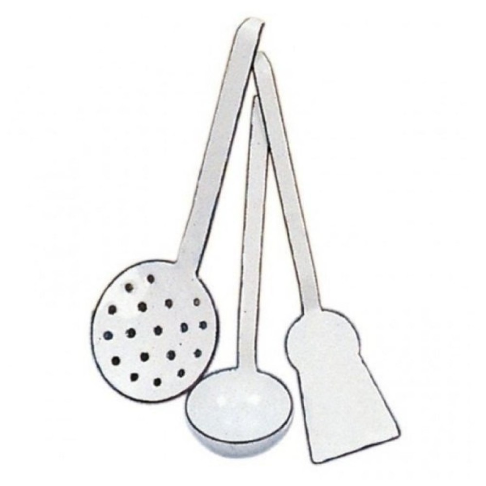 Набір кухонного приладдя – обов’язковий елемент дитячих ігор у «кухню». Без такого елементу не обійдеться жодне приготування страв. У наборі 3 деталі: черпак, шумівка і лопатка. Усі вони білосніжні з обідком синього кольору. Вироби емальовані, кожен завдовжки 17 см. Для дітей від 3-ох років. Виробник – німецький бренд іграшок nic.