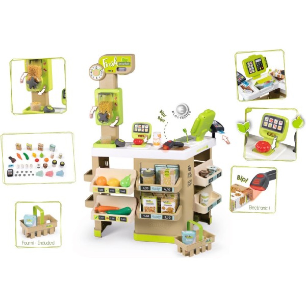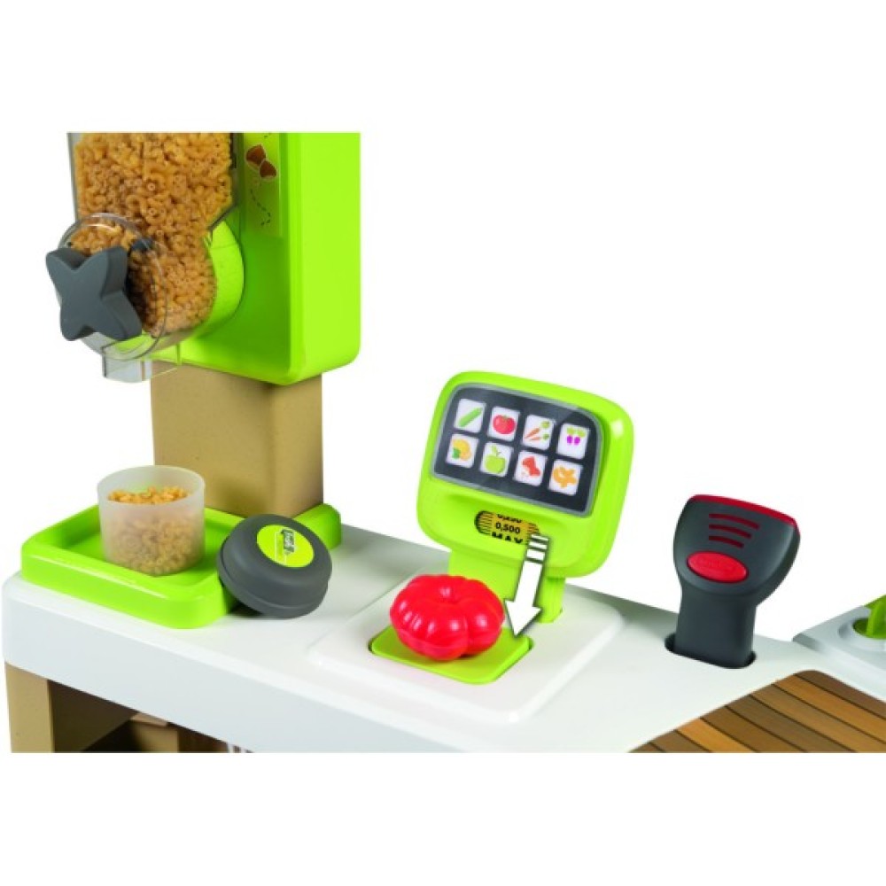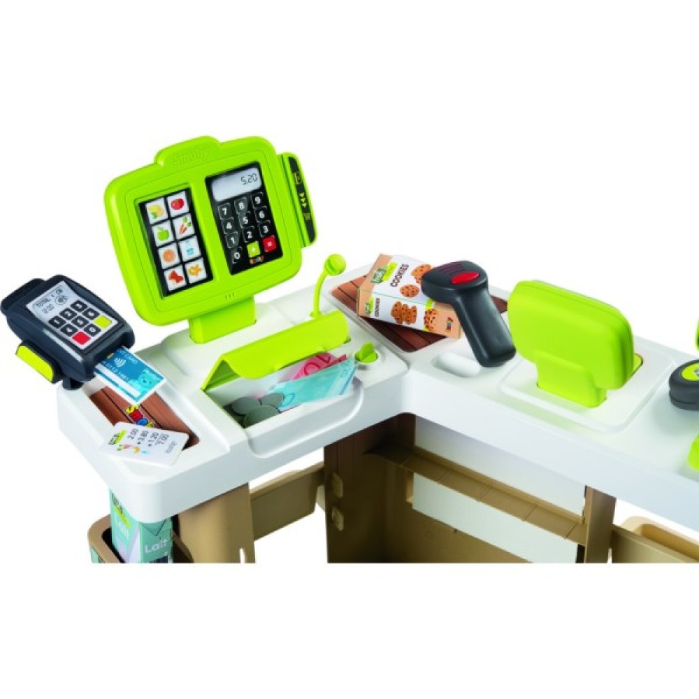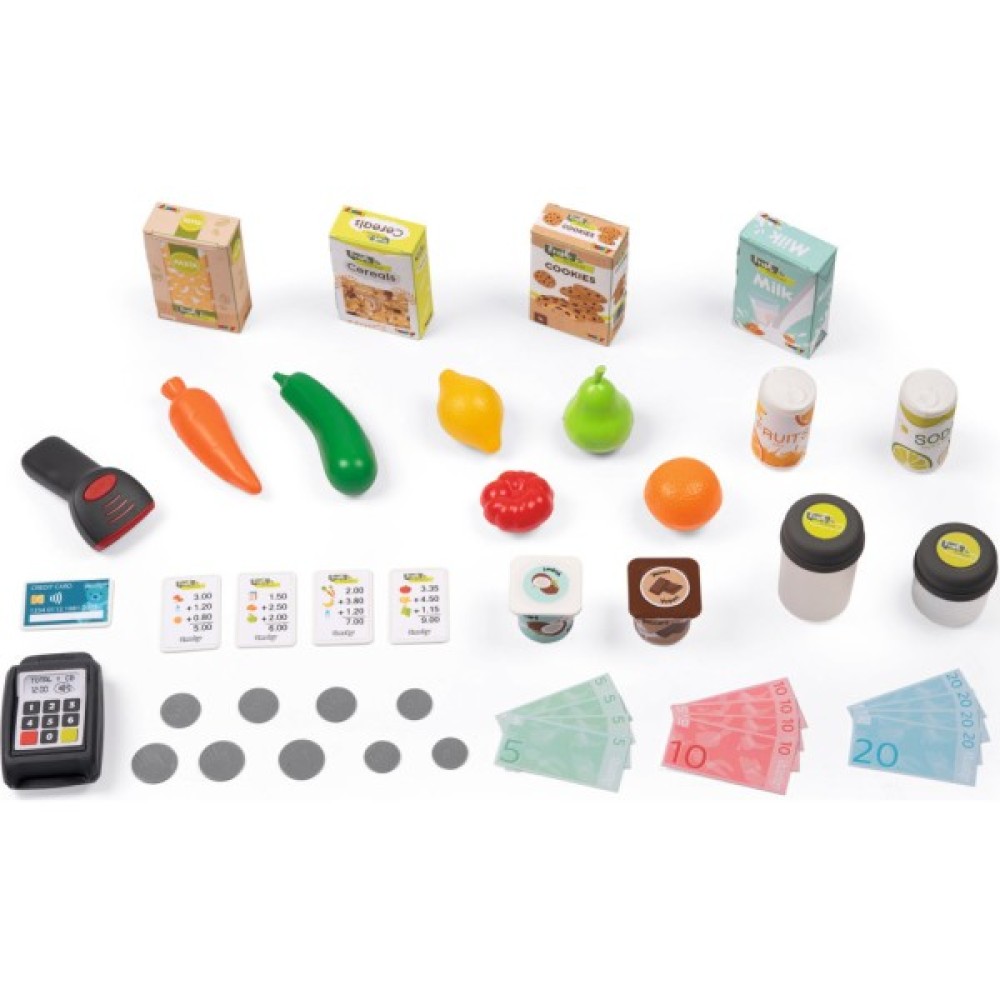 У набір входить 44 аксесуари: 4 чека, сканер, термінал, іграшкові гроші, баночки з напоями, овочі та фрукти, 4 картонні коробочки, 2 баночки йогурту, баночки для сипучих товарів.