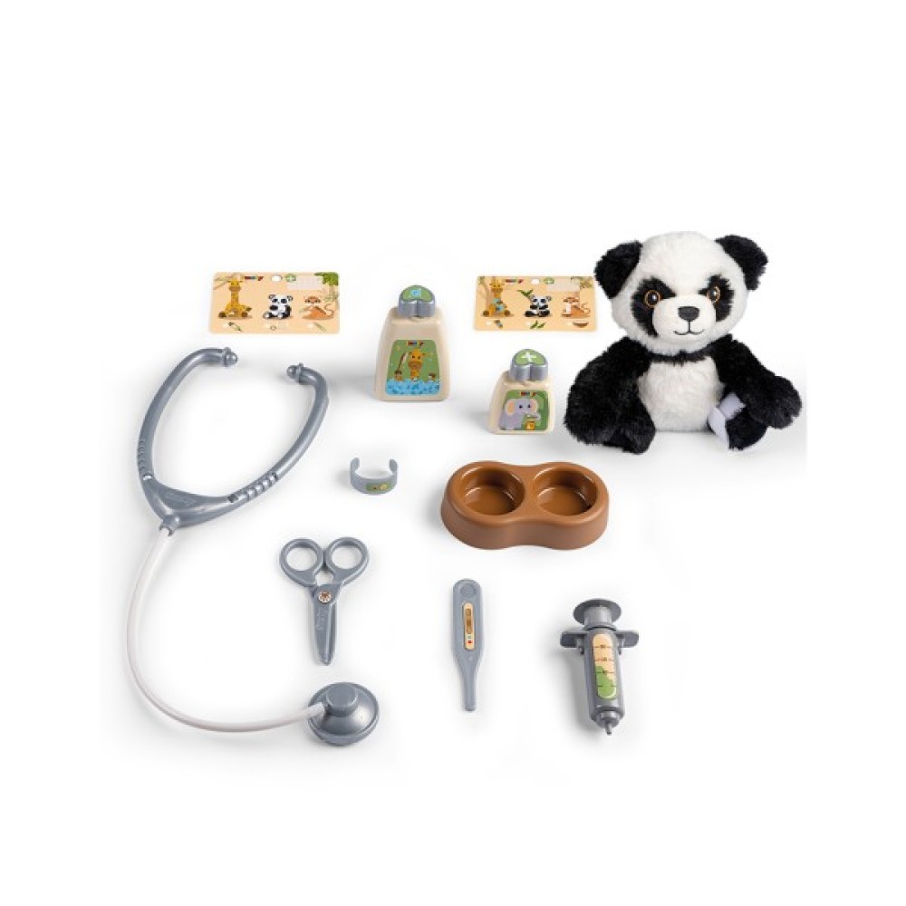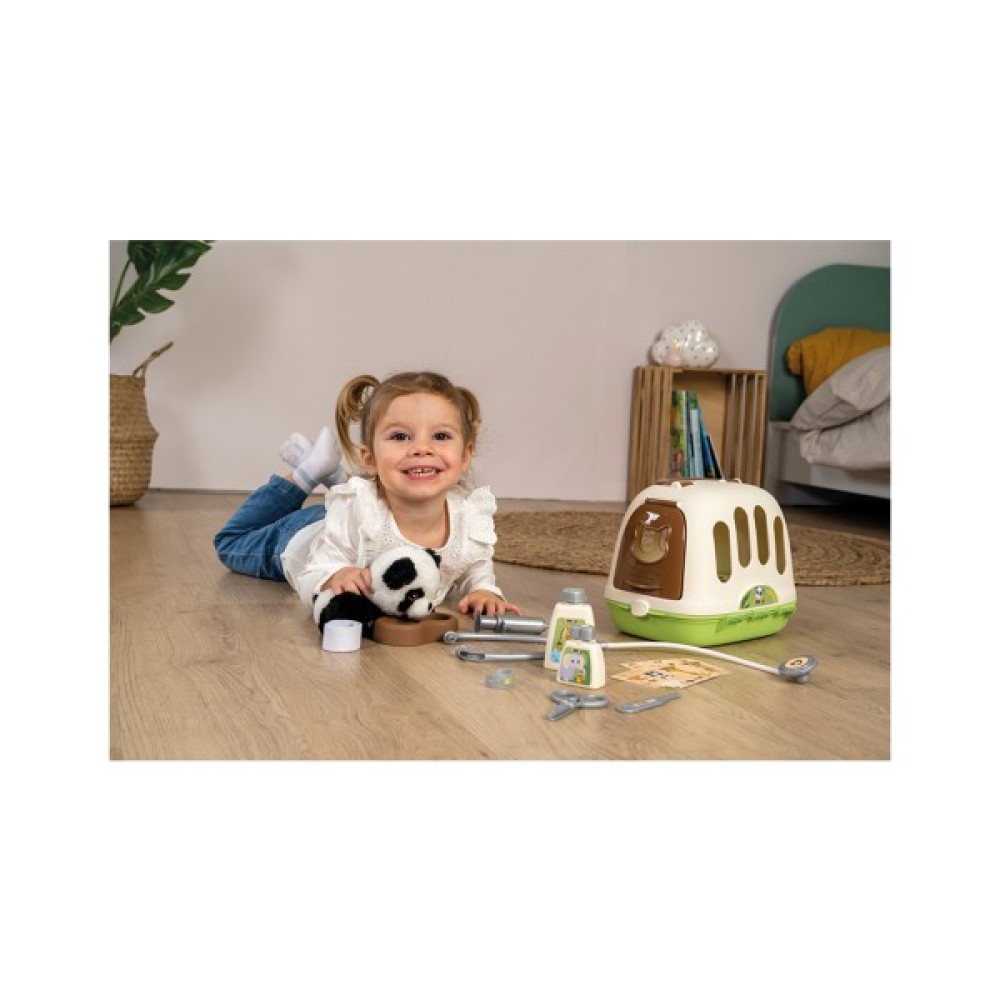 З набором Smoby Toys Переноска для догляду за тваринами з іграшкою пандою кожна дитина може відчути себе справжнім ветеринаром. Набір складається з переноски, м'якої іграшки панди та аксесуарів для догляду за твариною. Знявши верхню частину переноски, дитина побачить кейс з аксесуарами. В ньому є: мисочка, 2 пляшечки із засобами гігієни, медичні бланки, стетоскоп, ножиці, термометр, шприц та браслет.