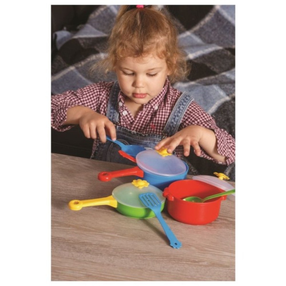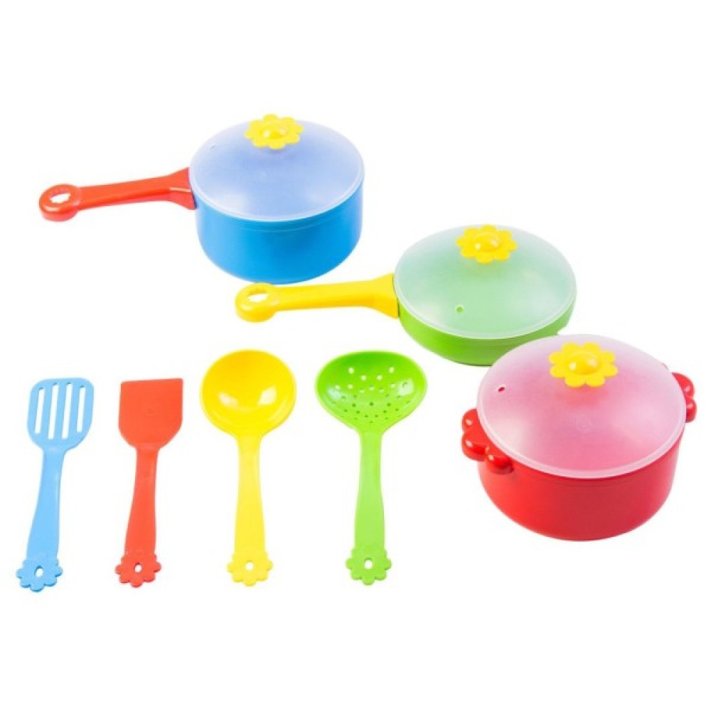 Набір іграшкового посуду столовий «Ромашка» з 10 елементів дасть можливість будь-якій дівчинці відчути себе шеф-кухарем. За допомогою сковорідок 2 видів, каструлі, двох лопаток, шумівки і ополоника вона зможе приготувати справжній бенкет. Ручка з пательні знімається, перетворюючи її в зручне блюдо для випічки.