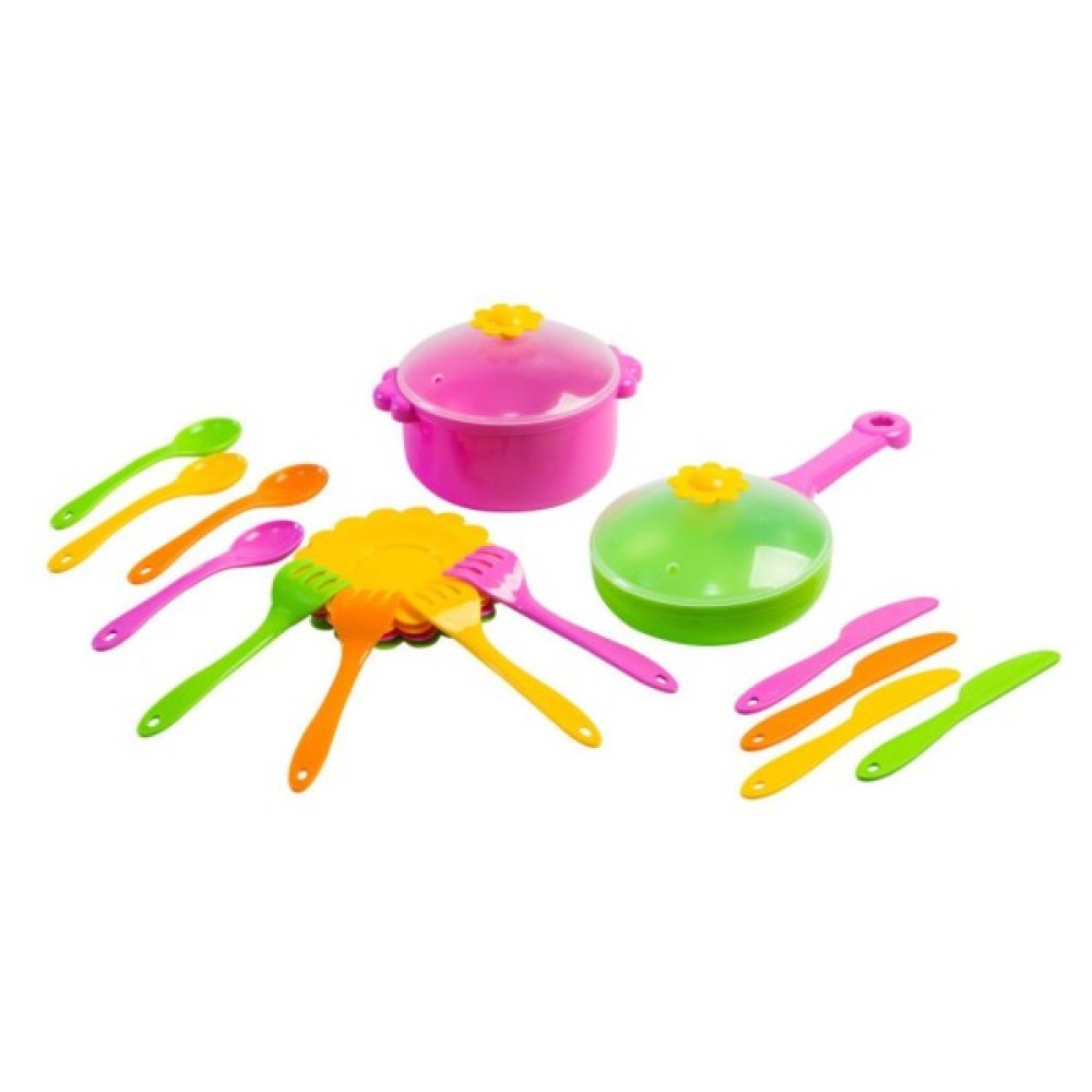 Набір іграшкового посуду столовий «Ромашка» з 20 елементів допоможе майбутній господині приготувати смачний обід за допомогою каструлі і сковорідки, а потім - красиво і апетитно його подати гостям за допомогою тарілок, ложок, виделок і ножів. Ромашковий дизайн робить набір ще більш цікавим і привабливим. Ручка з пательні знімається, перетворюючи її в зручне блюдо для випічки.