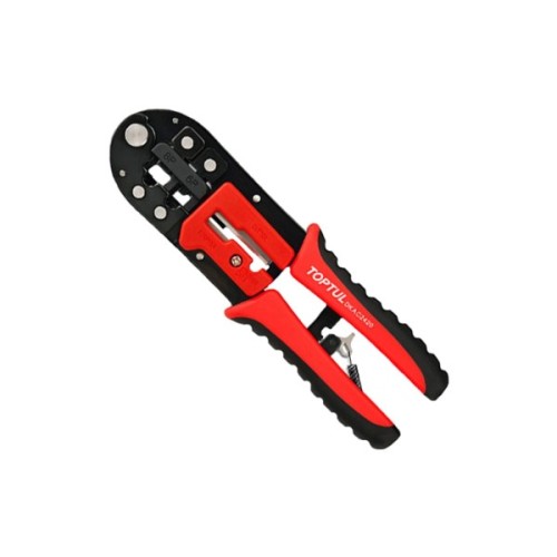 Кліщі для обтискання (RJ11/RJ12/RJ45) і зняття ізоляції тріскачкові Toptul DKAC2420 — професійний модульний обтискний інструмент із функціями відрізання й зачищення кабелю. Підходить для обтискання 6-позиційних роз'ємів RJ-11/RJ-12 і 8-контактних роз'ємів RJ-45.