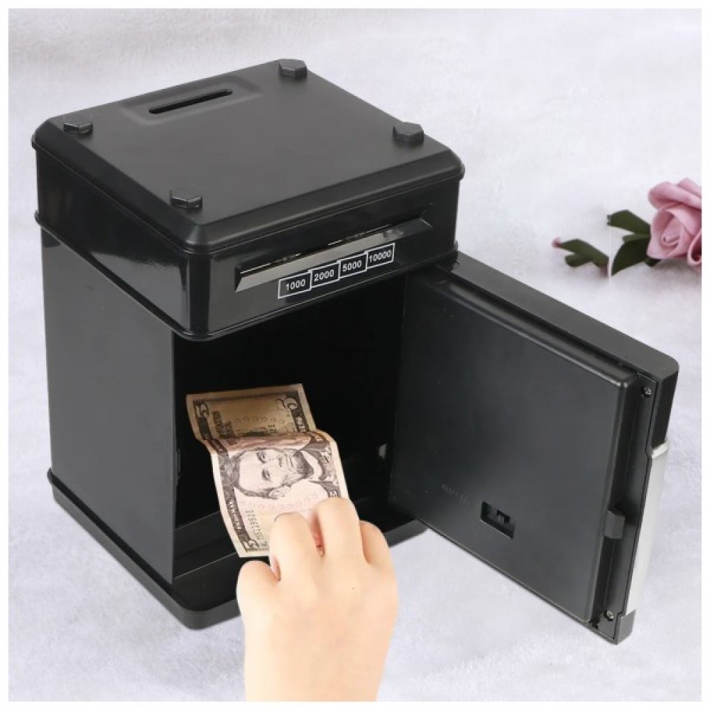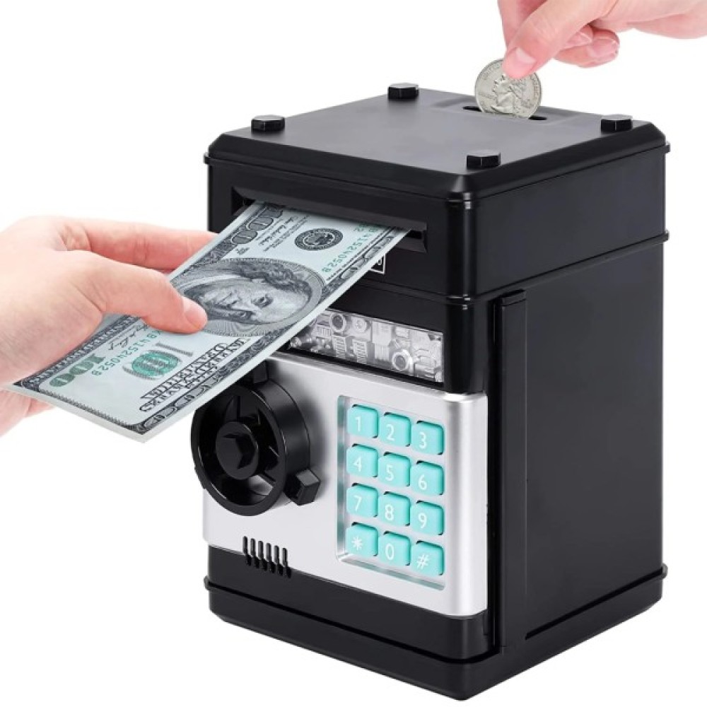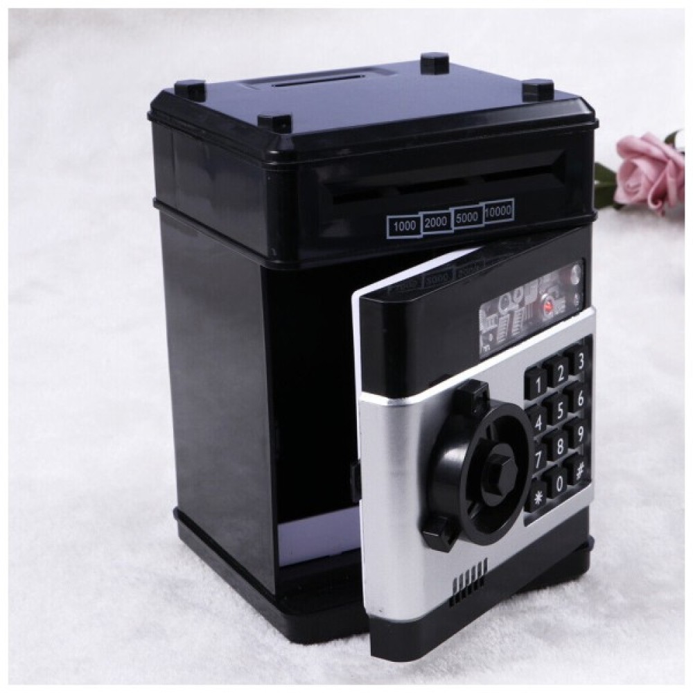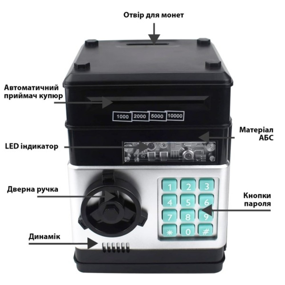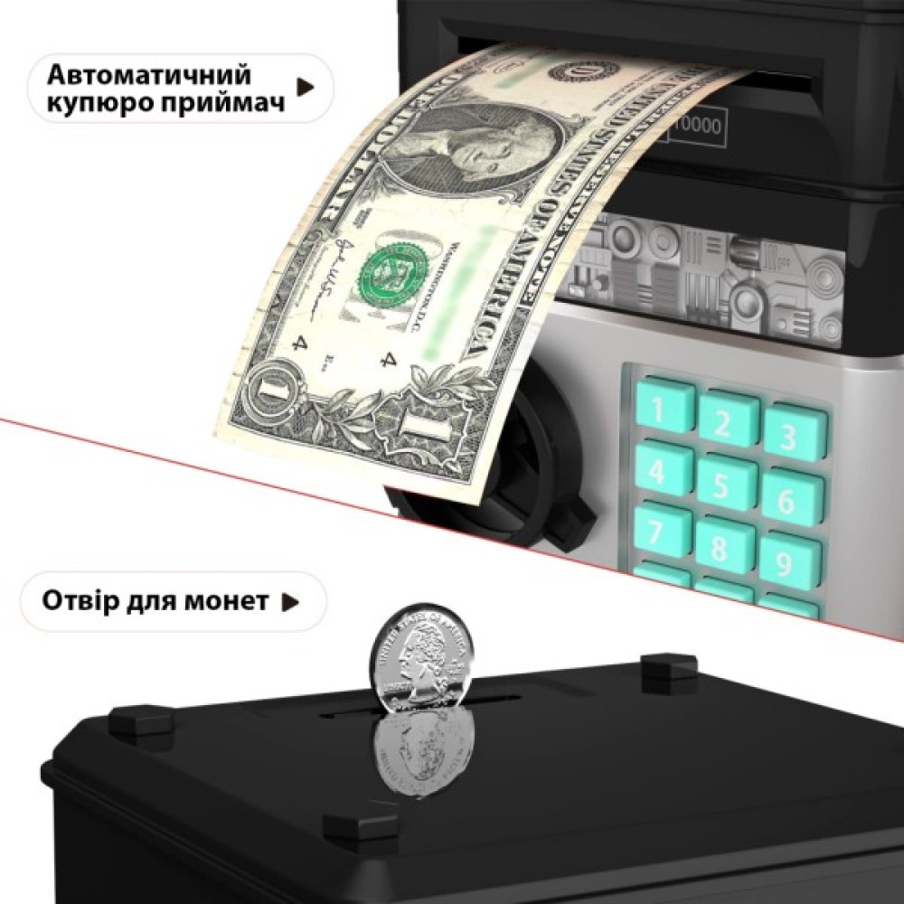 Скарбничка-сейф обладнана електронним механізмом, який приймає купюри, як термінал або банкомат. Як і справжній сейф, він має кодовий замок. Без правильного пароля скарбничка-сейф не відчиниться.